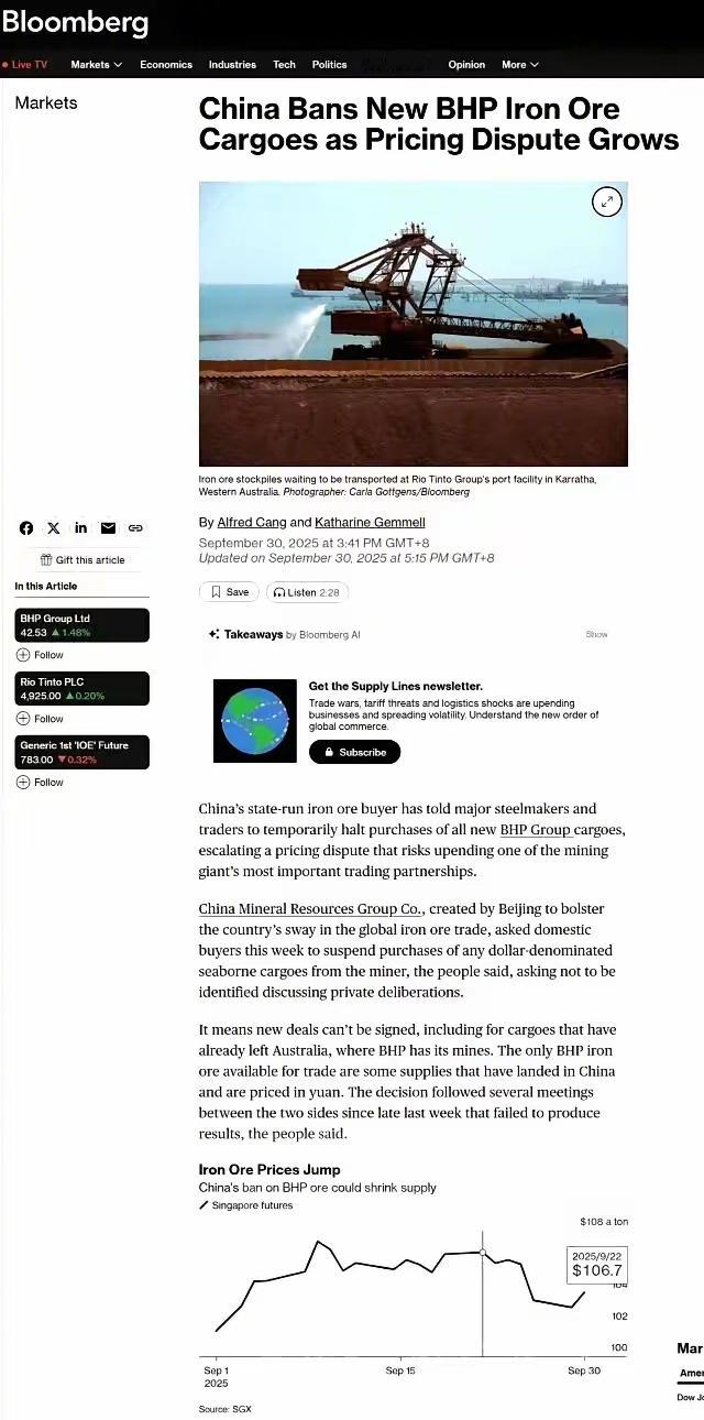 彭博:中国禁止采购以美元计价的必和必拓铁矿石。