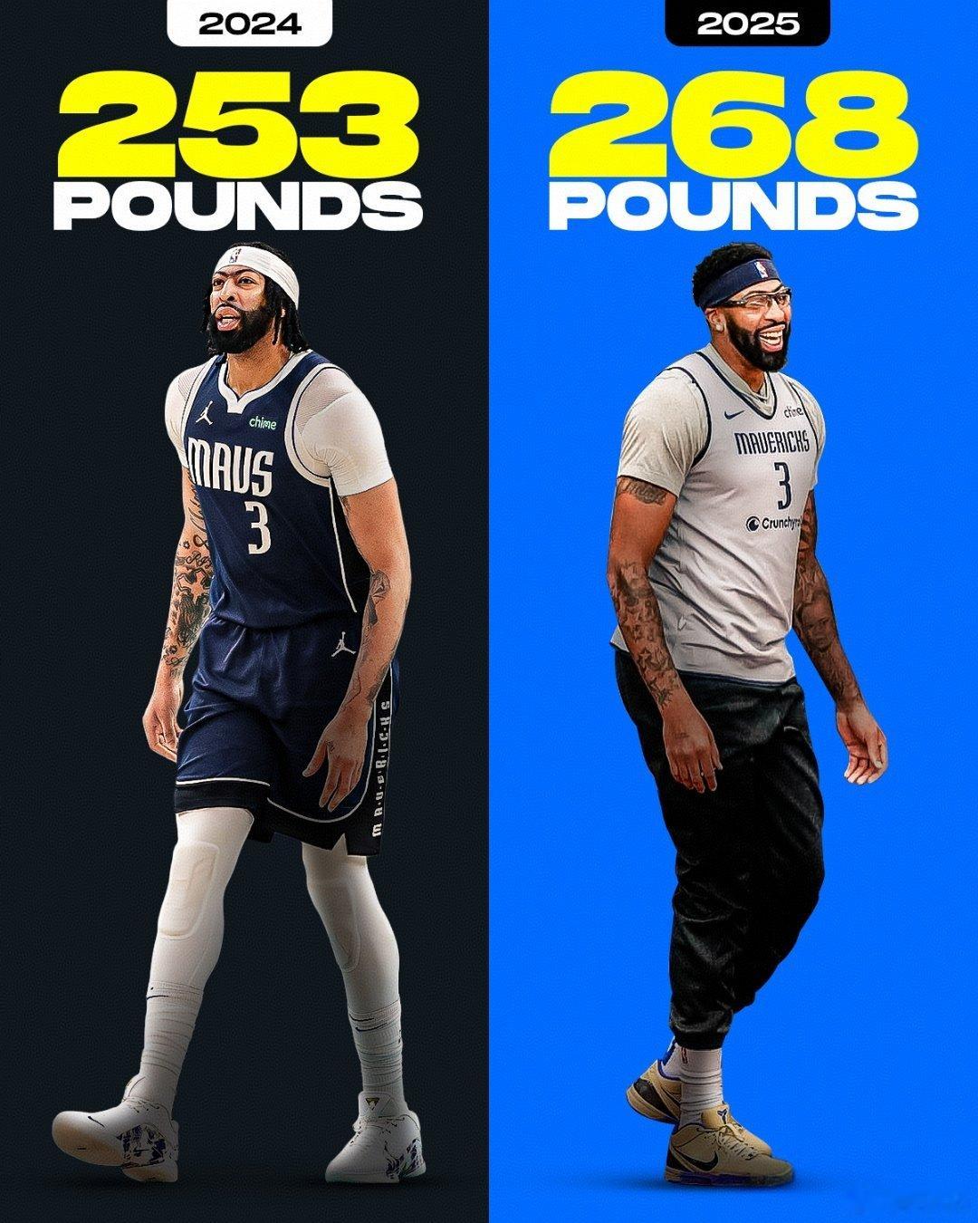 浓眉休赛期增重15磅。在本周训练营的官方名单中,戴维斯的登记体重为268磅。而去年训练营时体重为253磅。