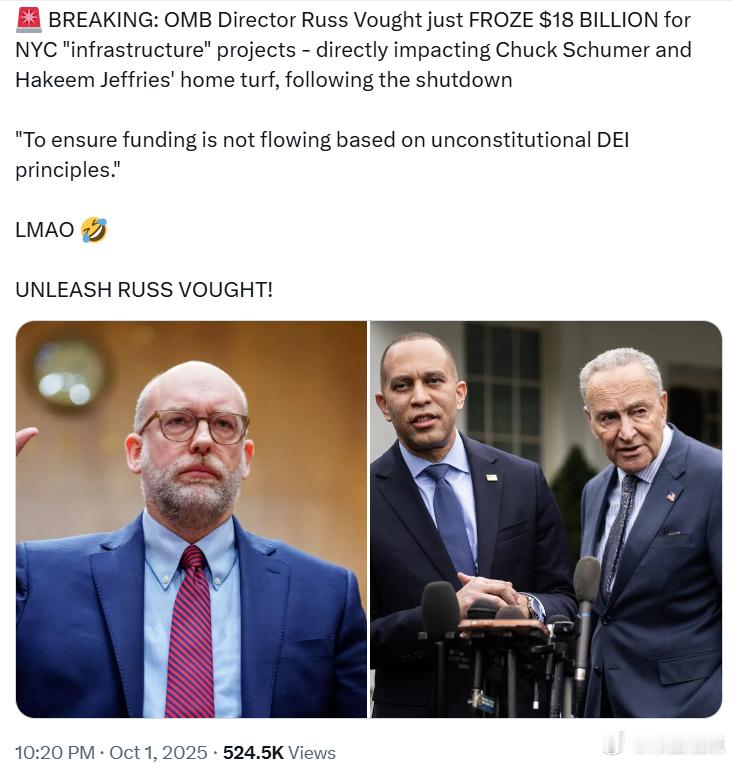白宫管理与预算局主任拉斯·沃特刚刚冻结了纽约市180亿美元的“基础设施”项目资金——直接影响了查克·舒默和哈基姆·杰弗里斯的家乡地盘,这是在关闭政府后采取的行动“以确保资金不基于违宪的DEI原则流动”。