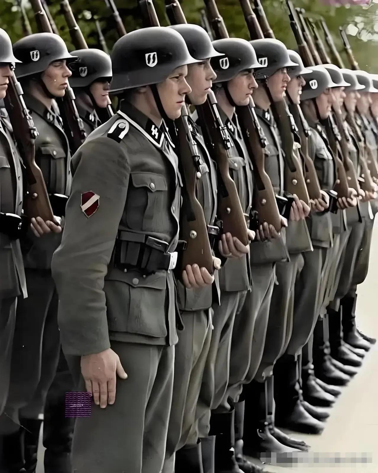 这是德军的哪支部队呢?从他们钢盔和领章的标志来看,并不像我们在影视剧中常见的作战部队。他们全都手握长枪,与影视剧中清一色手持自动冲锋枪的形象不同。不过,从队列军姿而言,十分整齐,并且他们年纪都不大,好似军校学员一般。不知我这猜想是否正确?