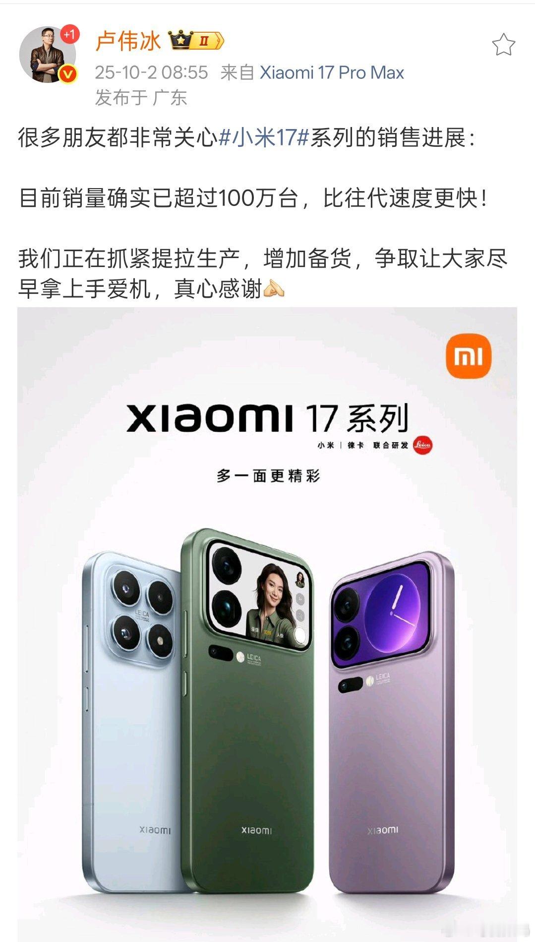 小米17系列销量破百万小米17系列销量超过100万啦[捂嘴哭]