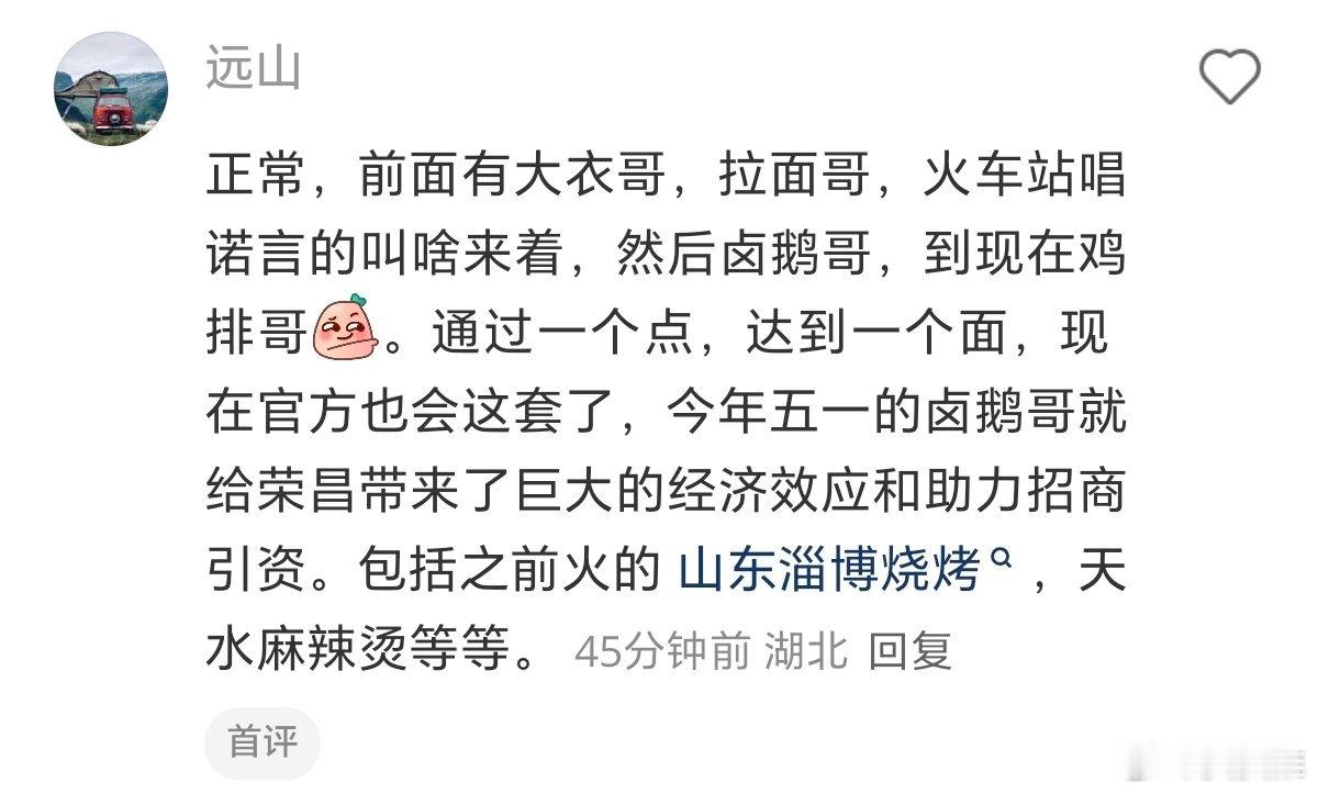 从大衣哥、拉面哥、卤鹅哥再到鸡排哥,都是通过一个点带动一个面,给当地文旅带来泼天的富贵。 ​​​