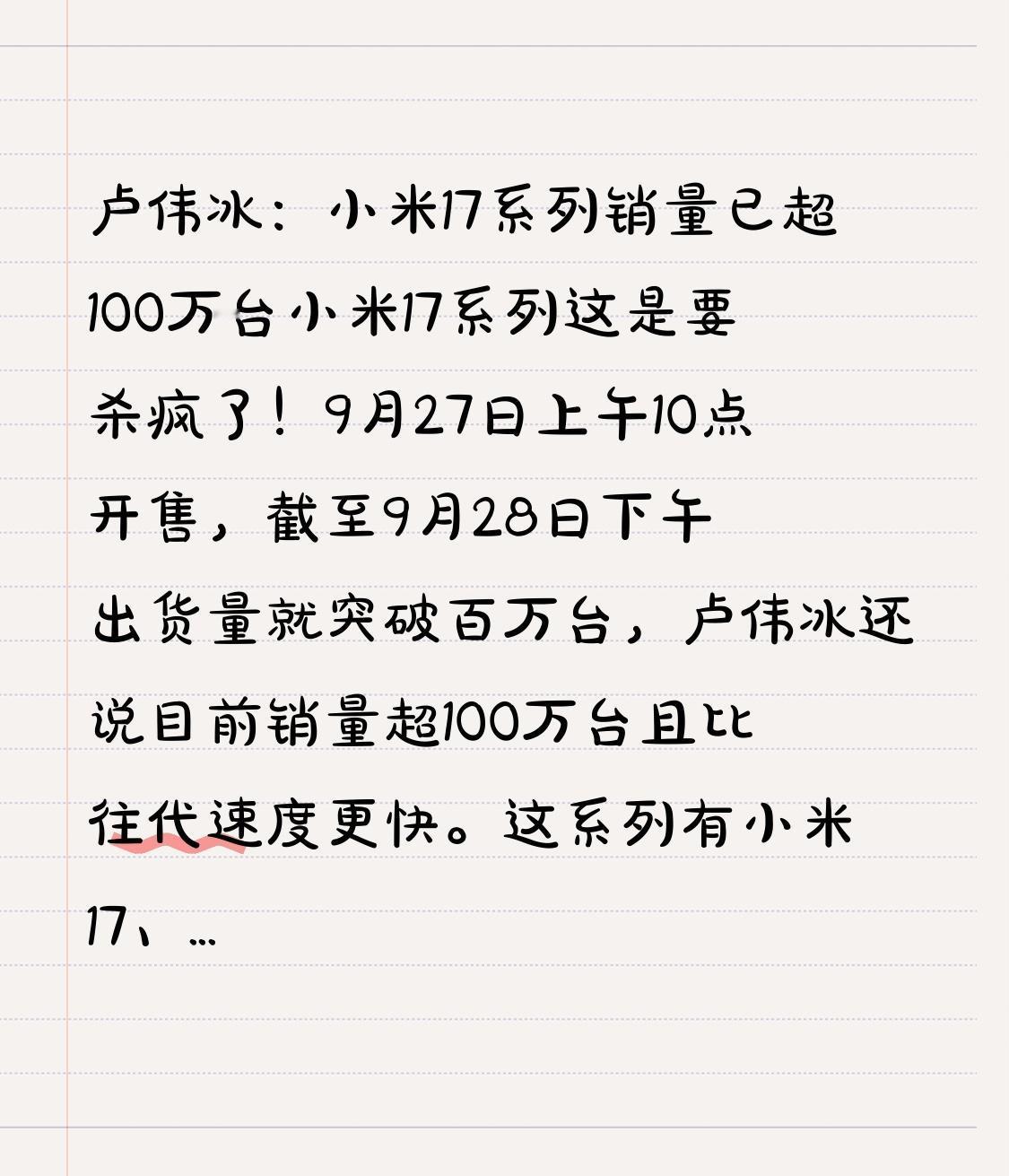 卢伟冰:小米17系列销量已超100万台 小米17系列这是要杀疯了!9月27日上午