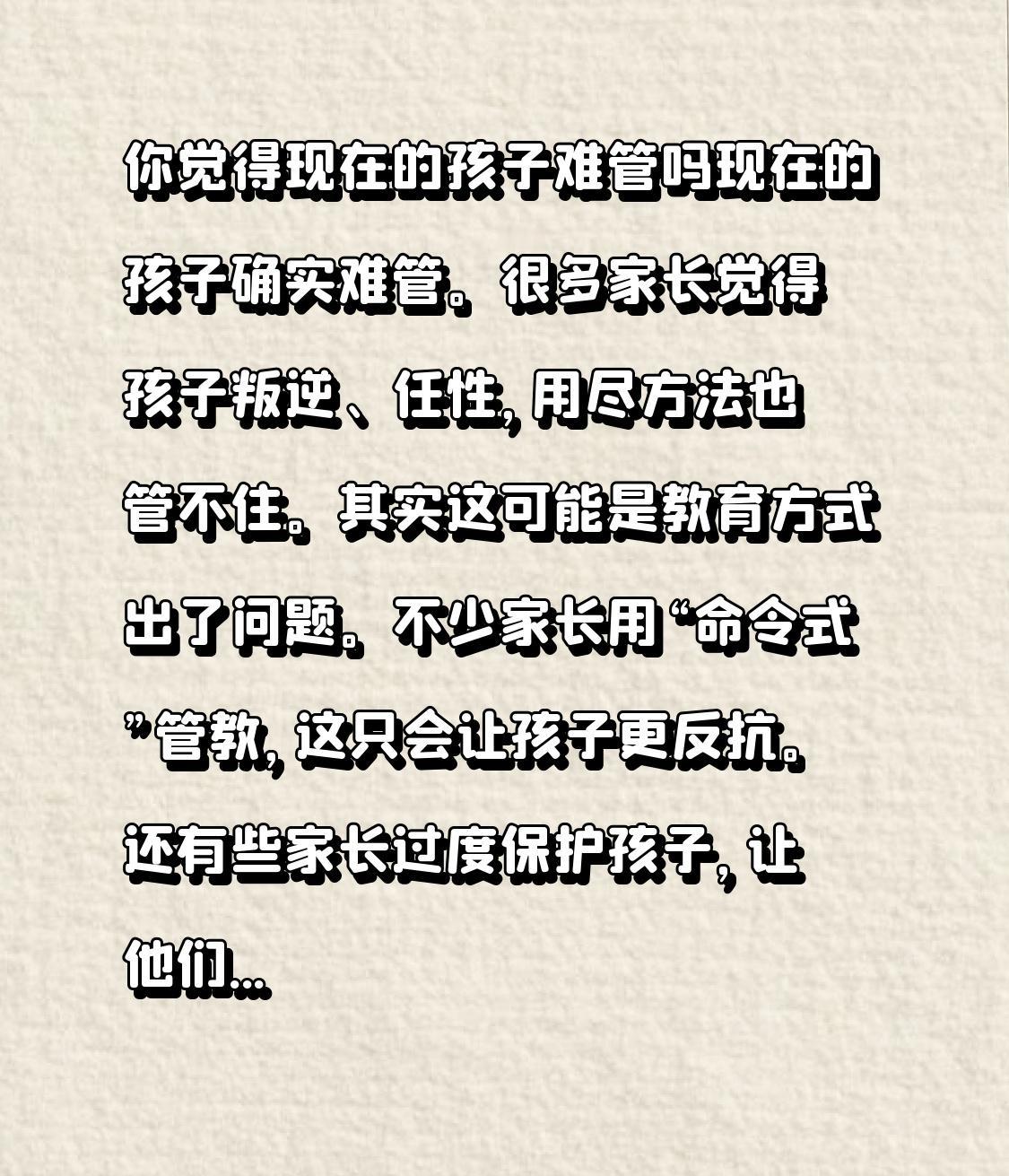你觉得现在的孩子难管吗叛逆期子女教育 叛逆期小孩 现在的孩子确实难管。很多家长觉得孩子叛逆、任性,用尽方法也管不住。其实这可能是教育方式出了问题。 不少家长用“命令式”管教,这只会让孩子更反抗。还有些家长过度保护孩子,让他们失去面对挫折的能力;给孩子没规则的自由,导致他们迷失方向。另外,沟通缺失也是大问题,很多家长只靠命令或惩罚,忽略孩子对理解和尊重的需求,甚至用打骂来管教,让孩子更叛逆。 而且,家长的情绪表达也很关键。像总向孩子诉苦,会让孩子产生自卑心理,影响一生。所以,要教育好孩子,得从改进教育方式和控制情绪开始。