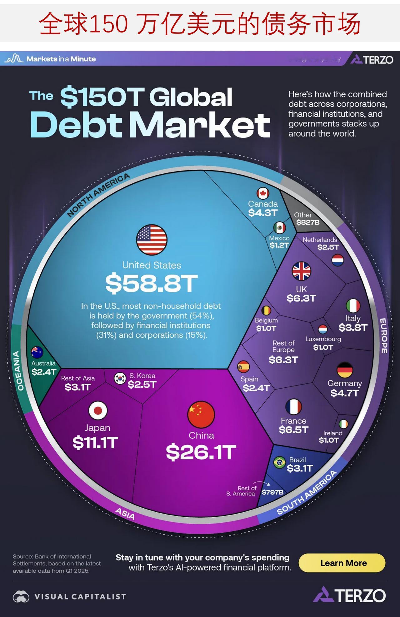 全球150 万亿美元的债务市场,哪些国家的债务负担最为沉重? 全球范围内的非家庭债务持续攀升,在 2025 年第一季度已达到 150 万亿美元。那么哪些国家的债务负担最为沉重呢? 这一“一分钟市场洞察”图表是与 Terzo 合作制作的,它详细展示了全球庞大的非家庭债务市场规模。 全球债务水平持续上升 2025 年第一季度,全球债务市场规模达到 150 万亿美元——这一数字令人震惊,因为世界银行预计 2024 年全球国内生产总值仅为 111 万亿美元,比债务少了近 40 万亿美元。而且债务水平较 2024 年第一季度也上涨了近 6%,当时其规模为 142 万亿美元。 推动这一增长的因素包括:新冠疫情相关的持续性支出需求、在地缘政治紧张局势下大幅增加的国防开支,以及旨在刺激疲软经济增长的财政措施。 全球绝大多数的顶级债务持有者来自发达市场。实际上,下图列出的国家中有 14 个属于这一类别,而只有三个(中国、巴西和墨西哥)被归类为新兴市场。 美国在全球非家庭债务中所占份额最大,达 58.8 万亿美元(占 39%)。其中,政府借款占了大部分(31.8 万亿美元),其次是金融企业的债务(18.1 万亿美元)和非金融企业的债务(8.7 万亿美元)。 中国以 26.1 万亿美元的规模位居第二,日本以 11.1 万亿美元的规模位列第三,这两个国家的增长主要来自政府债务。法国(6.5 万亿美元)和英国(6.3 万亿美元)则位列前五名。 对于投资者而言,了解哪些国家的非家庭债务水平大幅上升至关重要。高债务水平可能会带来一系列风险,从而影响经济增长前景,并促使有关税收、支出和利率的财政及货币政策决策。此外,它还会对全球金融市场的稳定性产生影响。