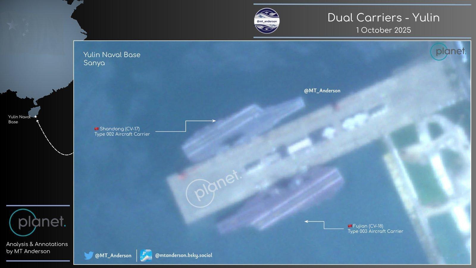 根据外网发布的卫星图像显示,“福建舰”与“山东舰”均已回港,并且于10月1日当天同框停放在了海南某军港,这绝对是一个历史性的画面。