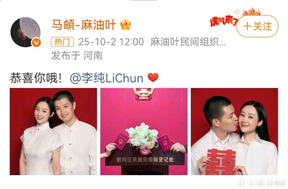 马頔李纯官宣结婚李纯马頔官宣结婚 10月2日和同时晒出结婚证。两人于2024年公开恋情,现在官宣领证结婚。恭喜恭喜![心] 李纯马頔结婚