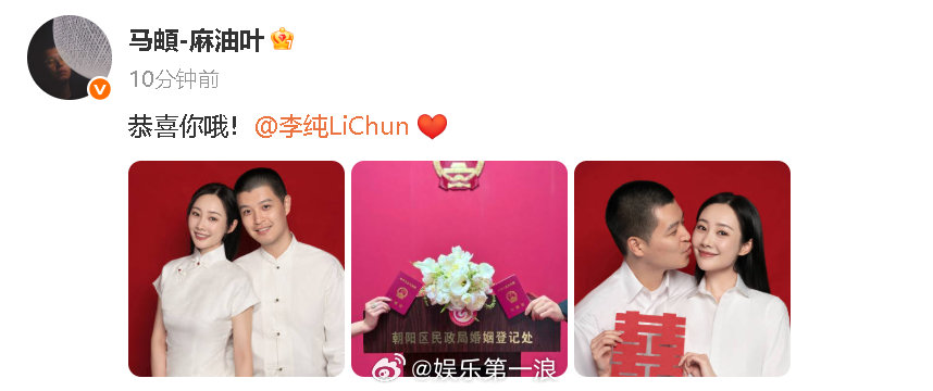 李纯马頔结婚李纯马頔官宣结婚 10月2日,官宣结婚,两人晒出红底照&领证现场照片,并互相喊话:“恭喜你哦!”十分甜蜜!据悉,2023年1月,两人在机场搂抱,恋情曝光,同年4月,马頔公开为李纯新片打call。2024年8月,李纯在节目中官宣与马頔恋情。恭喜! ​​​