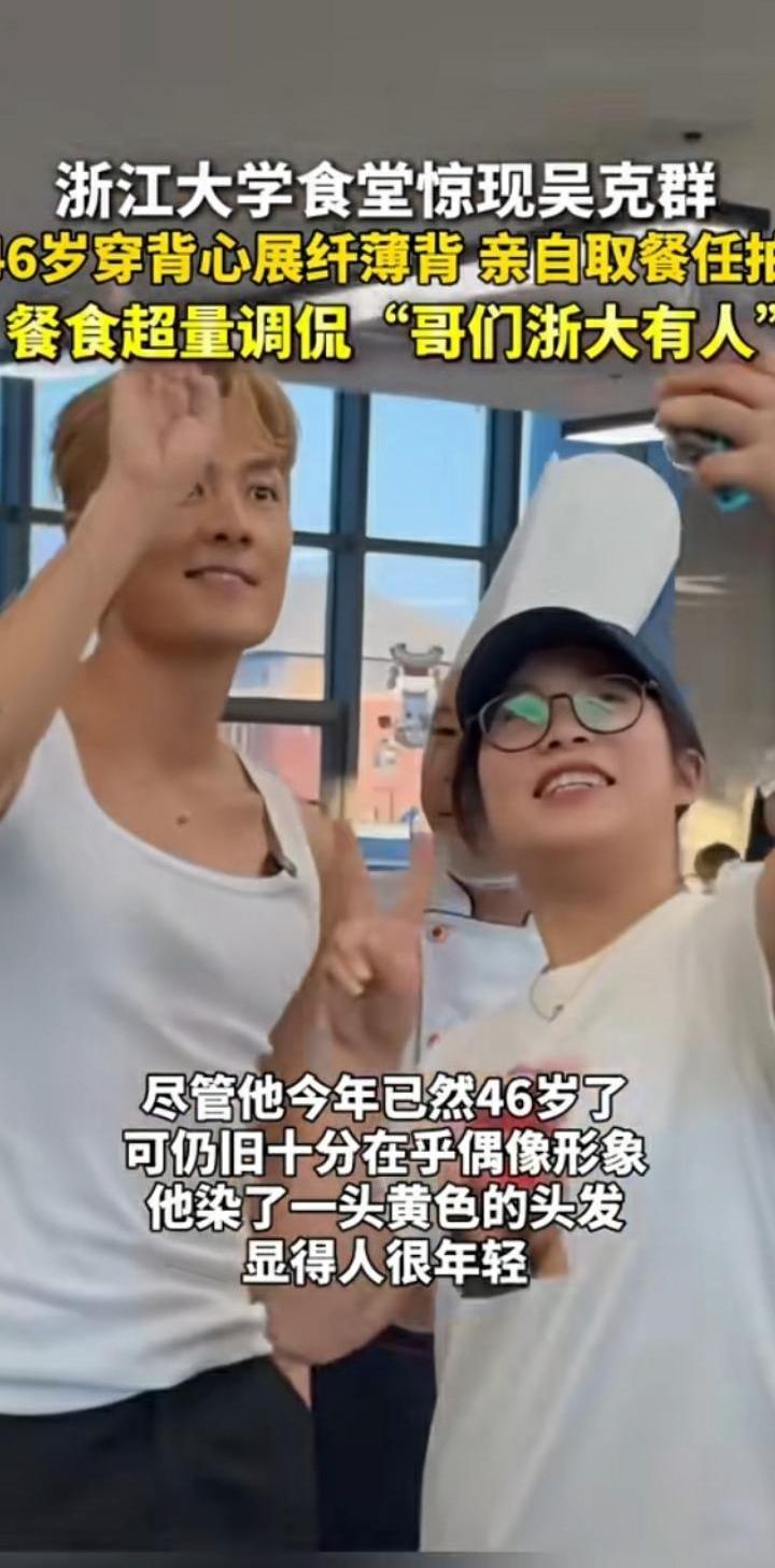 吴克群去浙江大学唱歌,没想到最出圈的不是舞台,反而是学生食堂。 一个44岁的歌手,染着一头金发,在演出前直接溜达到了浙大食堂里。 他不是走个过场,而是真的在看菜单,研究3块钱的葱油饼和19块的蟹黄拌饭,还跟身边人说“要相信同学们的味道”。 这一幕被学生拍下来传到网上,瞬间就炸了。现在很多明星出门恨不得清空一条街,他倒好,直接扎进人堆里,跟学生们没什么两样。这种不把自己当回事的亲近感,比任何精心设计的宣传稿都管用。 到了晚上正式演出,他一开口就是《为你写诗》《将军令》这些经典老歌,全场几千人大合唱,唱功稳得被学生夸是“行走的CD”。 这就说明了一件事,实力和真诚,永远是最好的通行证。 他既能在台上用业务能力征服观众,也能在台下用一个逛食堂的举动拉满好感。 这给浙大长了脸,也给自己圈了粉,简直是双赢。