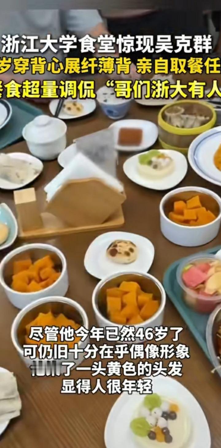 吴克群去浙江大学唱歌,没想到最出圈的不是舞台,反而是学生食堂。 一个44岁的歌