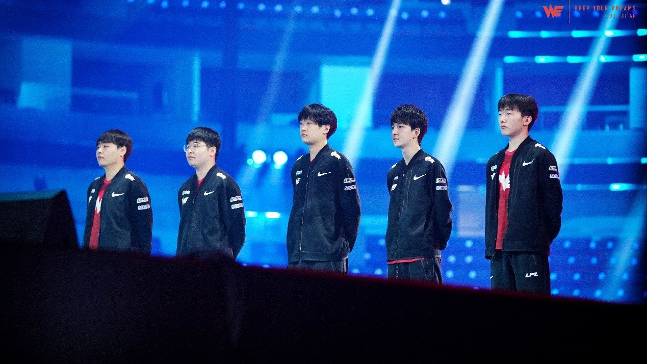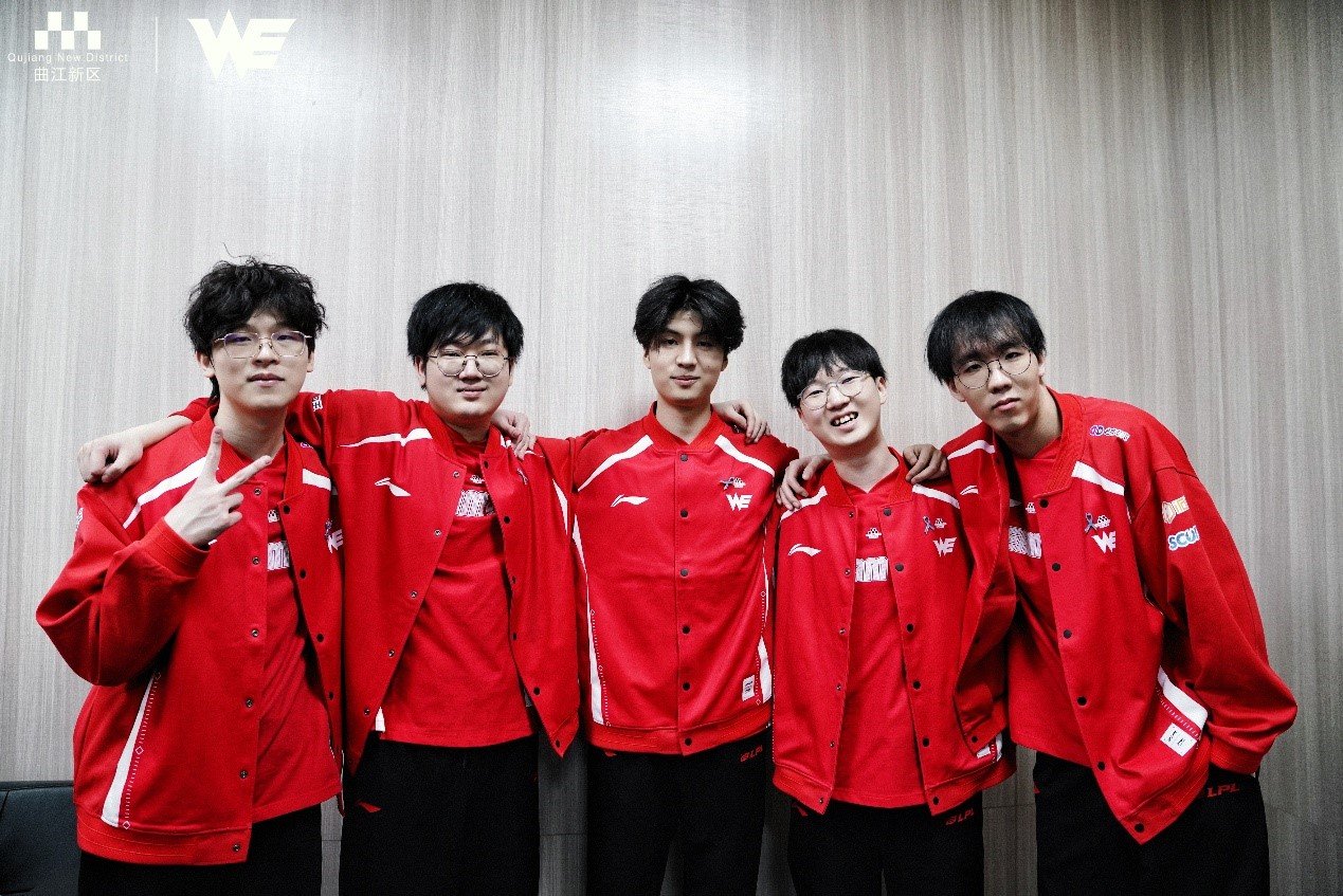 而在一千多公里外的西安主场,WE运营组的工作人员们一边忙着发线上物料,一边红了眼眶。当天比赛结束后,WE摄影师看到刚赢完比赛的五位队员,灵机一动,让他们模仿DWG拍了一张照片,Monki站在最前面摊开双手,后面是他的四位可靠的队友。