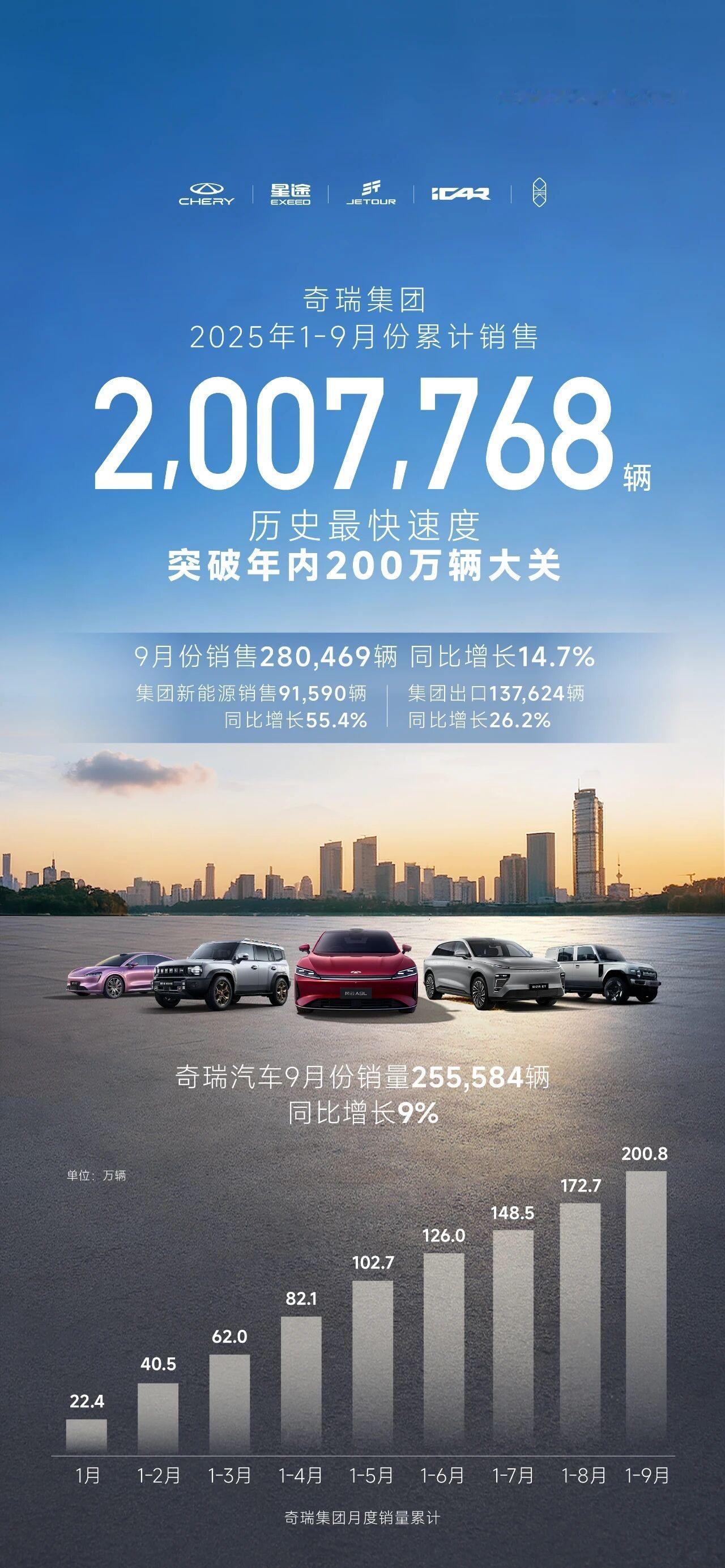 【同比增长14.5%!奇瑞集团前三季度销量超200万辆】日前,奇瑞集团官宣:9月份,集团销售汽车280469辆,同比增长14.7%;销售新能源汽车91590辆,同比增长55.4%;出口汽车137624辆,同比增长26.2%,连续五个月出口突破10万辆,继续保持中国汽车出口第一。具体来看,奇瑞品牌销售汽车169580辆;星途品牌销售汽车10802辆;捷途品牌销售汽车56586辆;iCAR品牌销售汽车10734辆;智界品牌销售汽车7882辆。值得一提的是,奇瑞集团累计销售汽车200.7万辆,同比增长14.5%,历史最快速度突破年内200万辆大关,创历史新高。