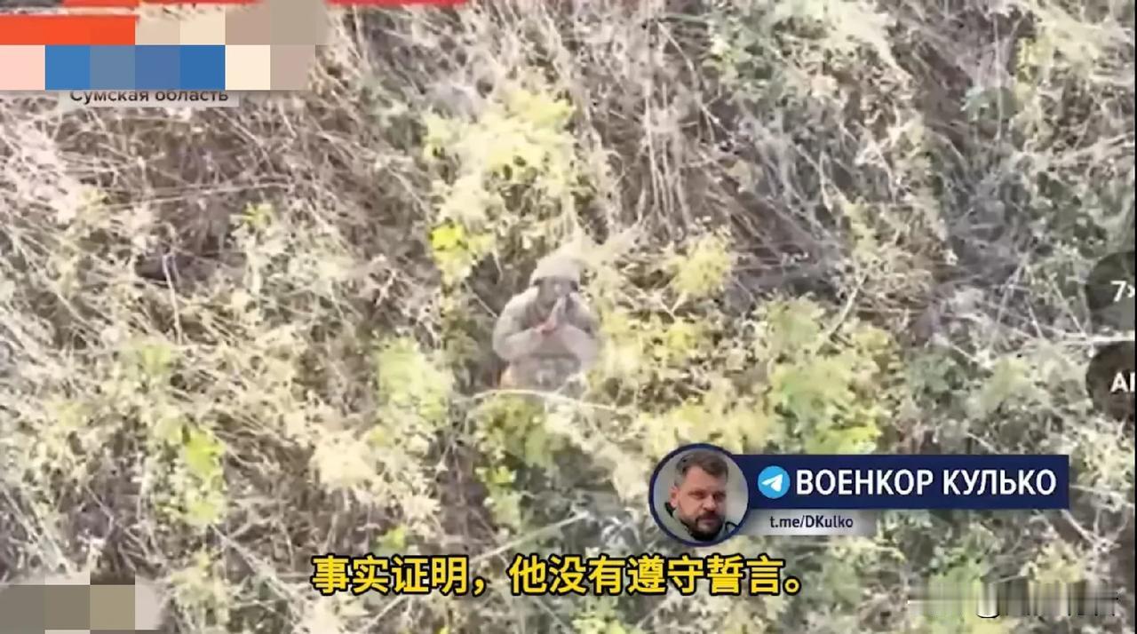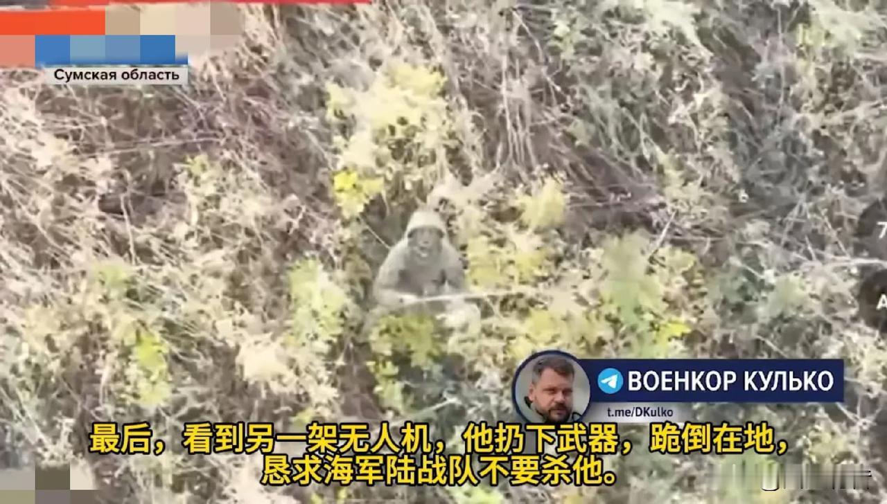 俄乌冲突残酷战场传来搞笑的一幕:近日,俄军发布了一段视频,一支17人的乌军小队被打得仅剩一名士兵,这名士兵试图逃离战场时,不幸被俄军无人机盯上,顷刻间一枚炸弹就在身边爆炸。硝烟散尽之后,只见乌军士兵跪在草丛里,双手合十向俄军无人机祈求投降。俄军放过了这名乌军士兵,允许他投降。 事情到这里还没有结束。俄军在审问投降的这名乌军士兵时,发现在他的手臂上刺着一行字,翻译过来就是“宁可站着死,绝不跪着生”。有网友模仿这名乌军的语气说:“那是以前的我,不是现在的我。”还有网友接龙道:“适才相戏耳。”