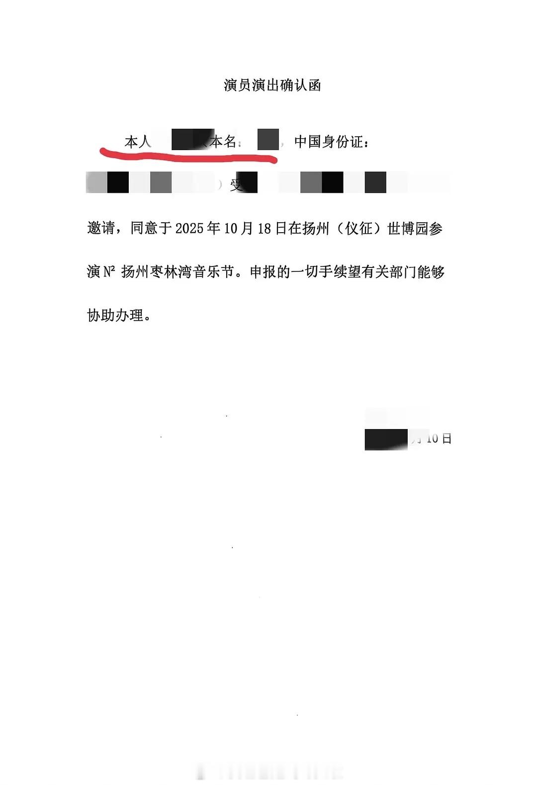 粉丝期待的舞台首秀泡汤了,晒了演出确认函,但把对方名字打码了。