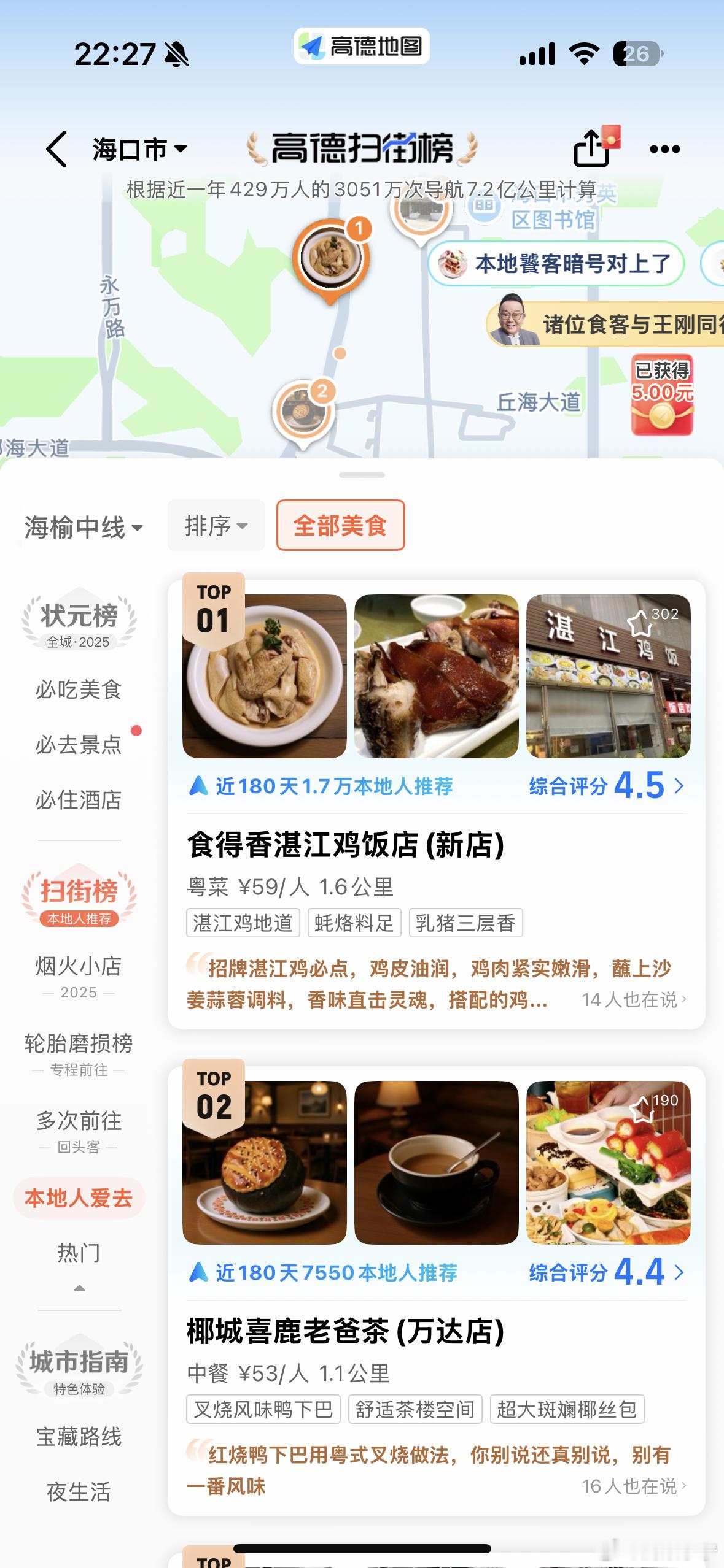 不怕你们笑话!没来海南之前我以为本地人天天吃海鲜[笑cry]。来了才知道:白切鸡,烤乳猪,椰子鸡,清补凉,糟粕醋,老爸茶……多到数不清。这里朋友少,我之前想找地道美食,不想当冤大头,就用这招!打开高德地图——