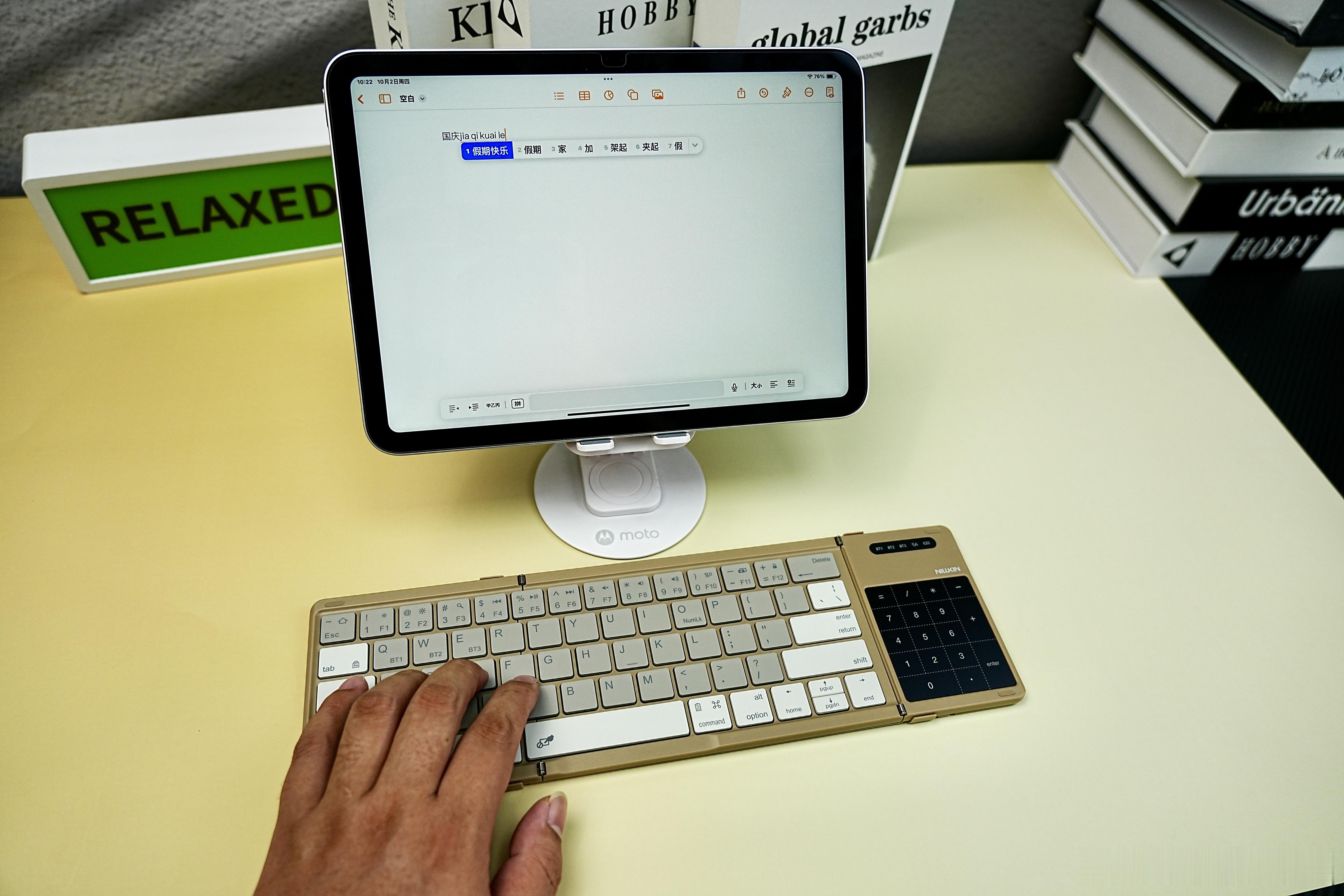 值得一提的是,采用数字键+触控板二合一设计,支持多点触控手势和防误触技术,更可以同时连接3个设备,键盘会弹利落,64键精简配列,内置蓝牙5.0高速稳定传输,出门在咖啡厅、高铁、飞机上都能轻松使用。用了一段时间给我最大的感受就是方便!设计灵感顾虑到日常办公和出差的场景,折起来和手机大小差不多,续航时间也很长,响应速度非常快,带上出门就能生产力翻倍!