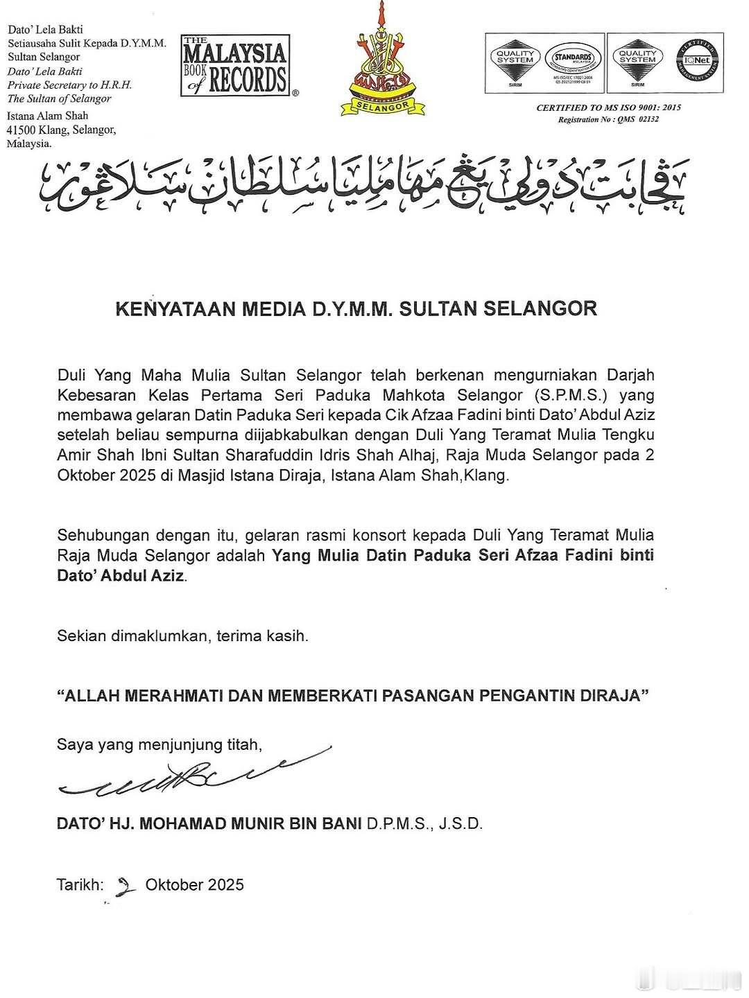 马来西亚王室 🇲🇾10月2日,雪兰莪州苏丹沙拉夫丁正式册封儿媳妇阿芙扎·法蒂妮女士为雪兰莪州王储妃。[赞啊][赞啊][赞啊][微风][微风][微风]世界各国王室[超话]Yang Mulia Datin Paduka Seri,并授予王储妃雪兰莪王冠一级功绩勋章。
