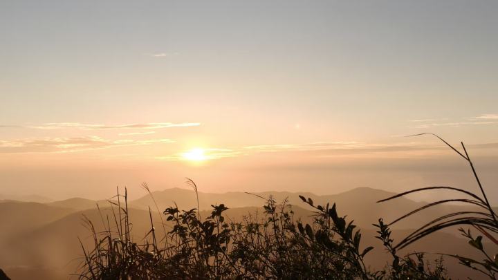 5点47分,在静止云带的缝隙里,一轮红色火球依稀可见,视力所及显得温柔不刺眼,6点,火球变身金色大日完全跃出云带,刺眼得很,静待日出的13分钟显得格外漫长,观日的人们变得安静,远山的鸡鸣声再次传来……