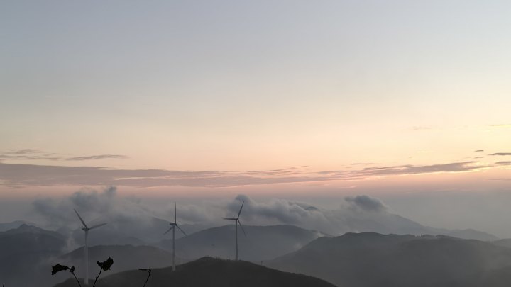 5点38分,天光越来越亮了,东白山林子里的鸟鸣声从几声低鸣到此起彼伏,第一次离山顶的风车如此之近,风叶转动的声音一直在耳旁轰鸣,远空的云像静止的丝带,隐着的金光把丝带镀上斑斓的色彩,近空风裹挟着深灰色的云雾,不断从斑斓的云带前飘过,远山的鸡鸣声也被风捎了过来。