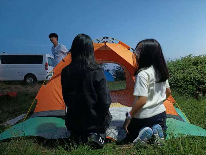 傍晚基地的夜色极美,晚霞傍着山风虫鸣及篷顶泻下的银光,弯月空悬,帐篷棋布,于山野抖落一身浮躁,帐篷两顶陡然护住满山的风,好不快哉!