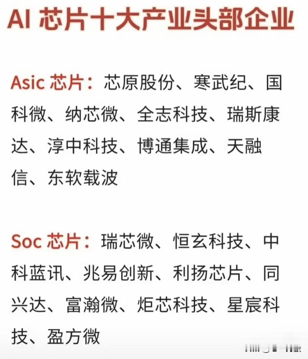 “AI芯片十大产业头部企业”的分类汇总信息,涵盖了中国在多个关键芯片细分领域的代