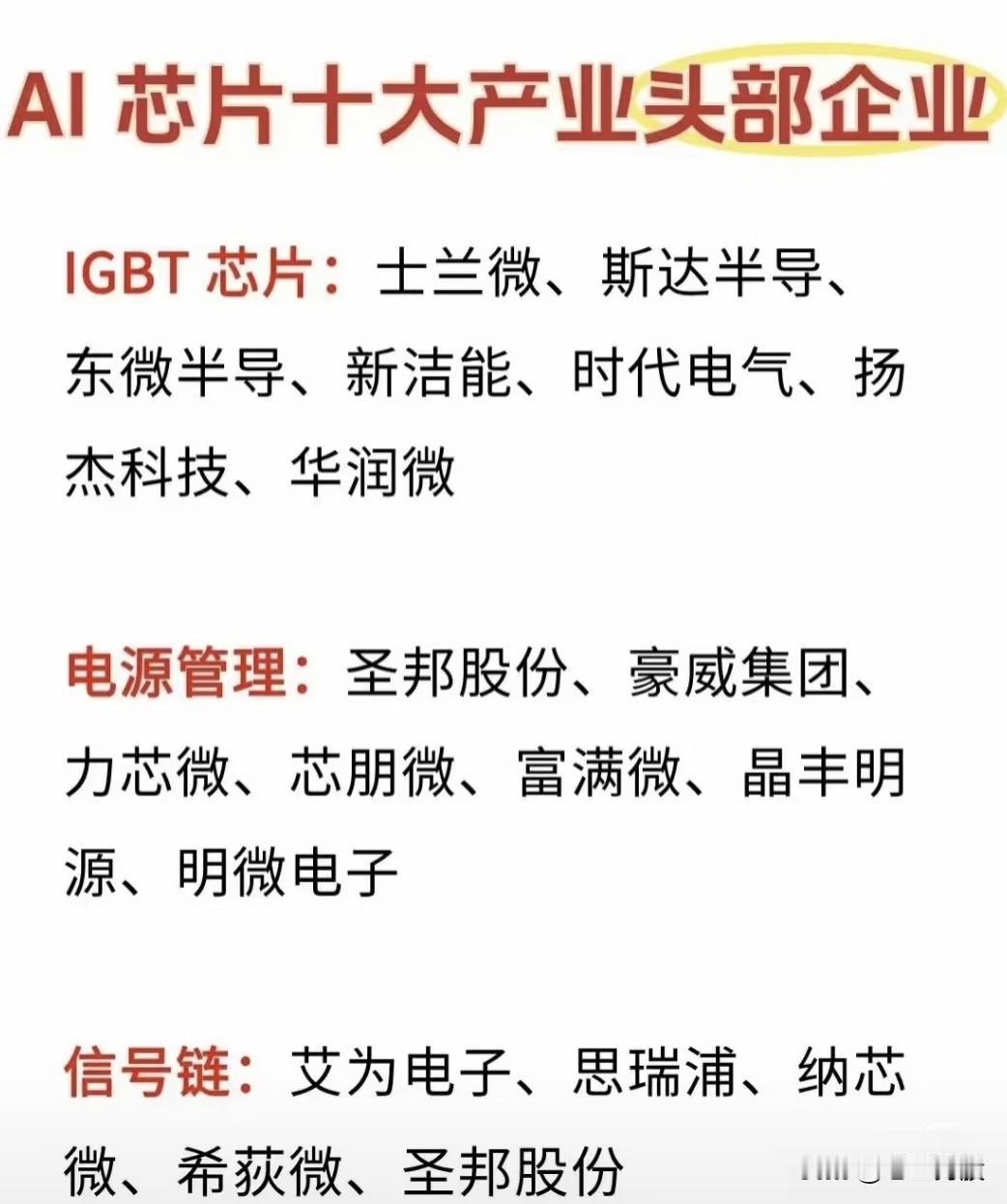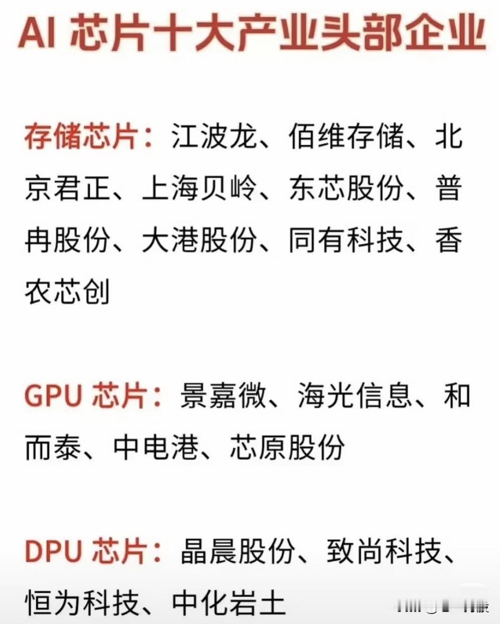 “AI芯片十大产业头部企业”的分类汇总信息,涵盖了中国在多个关键芯片细分领域的代表性企业。 第一张图片聚焦于三大类芯片企业: - CPU芯片:包括中国长城、龙芯中科、海光信息、中科曙光、澜起科技,共5家; - MCU芯片:有兆易创新、芯海科技、中颖电子、乐鑫科技、国芯科技,共5家; - EDA设计:列出华大九天、广立微、概伦电子,共3家。 第二张图片则介绍了另外三类芯片的相关企业: - 存储芯片:包含江波龙、佰维存储、北京君正、上海贝岭、东芯股份、普冉股份、大港股份、同有科技、香农芯创,共9家; - GPU芯片:有景嘉微、海光信息、和而泰、中电港、芯原股份,共5家; - DPU芯片:包括晶晨股份、致尚科技、恒为科技、中化岩土,共4家。 第三张图片重点展示了两类专用芯片的企业名单: - ASIC芯片:列出芯原股份、寒武纪、国科微、纳芯微、全志科技、瑞斯康达、淳中科技、博通集成、天融信、东软载波等多家企业(以长串、悬挂缩进格式呈现,便于阅读); - SoC芯片:包括瑞芯微、恒玄科技、中科蓝讯、兆易创新、利扬芯片、同兴达、富瀚微、炬芯科技、星辰科技、盈方微等企业。 第四张图片则围绕三类模拟与功率类芯片展开: - IGBT芯片:有士兰微、斯达半导、东微半导、新洁能、时代电气、扬杰科技、华润微,共7家; - 电源管理:包括圣邦股份、豪威集团、力芯微、芯朋微、富满微、晶丰明源、明微电子,共7家; - 信号链:列出艾为电子、思瑞浦、纳芯微、希荻微、圣邦股份,共5家。 以上内容系统梳理了中国在AI芯片相关核心领域(包括CPU、MCU、EDA、存储、GPU、DPU、ASIC、SoC、IGBT、电源管理、信号链等)的头部企业,涉及超过50家具有代表性的厂商,反映了国内在人工智能芯片产业链各环节的技术实力与产业布局。