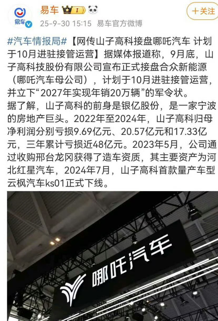 网传山子高科接盘哪吒汽车