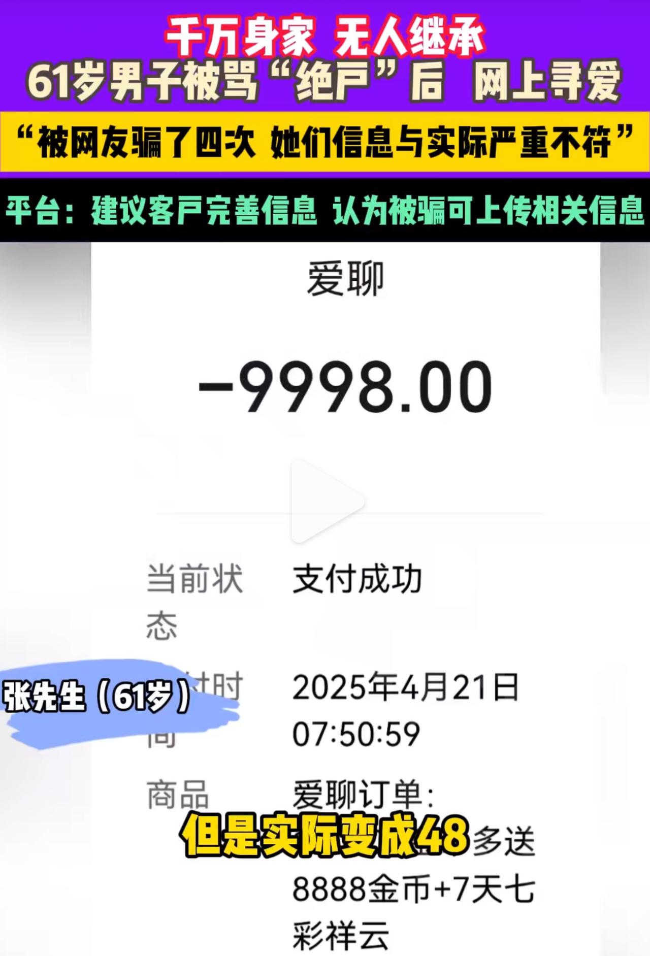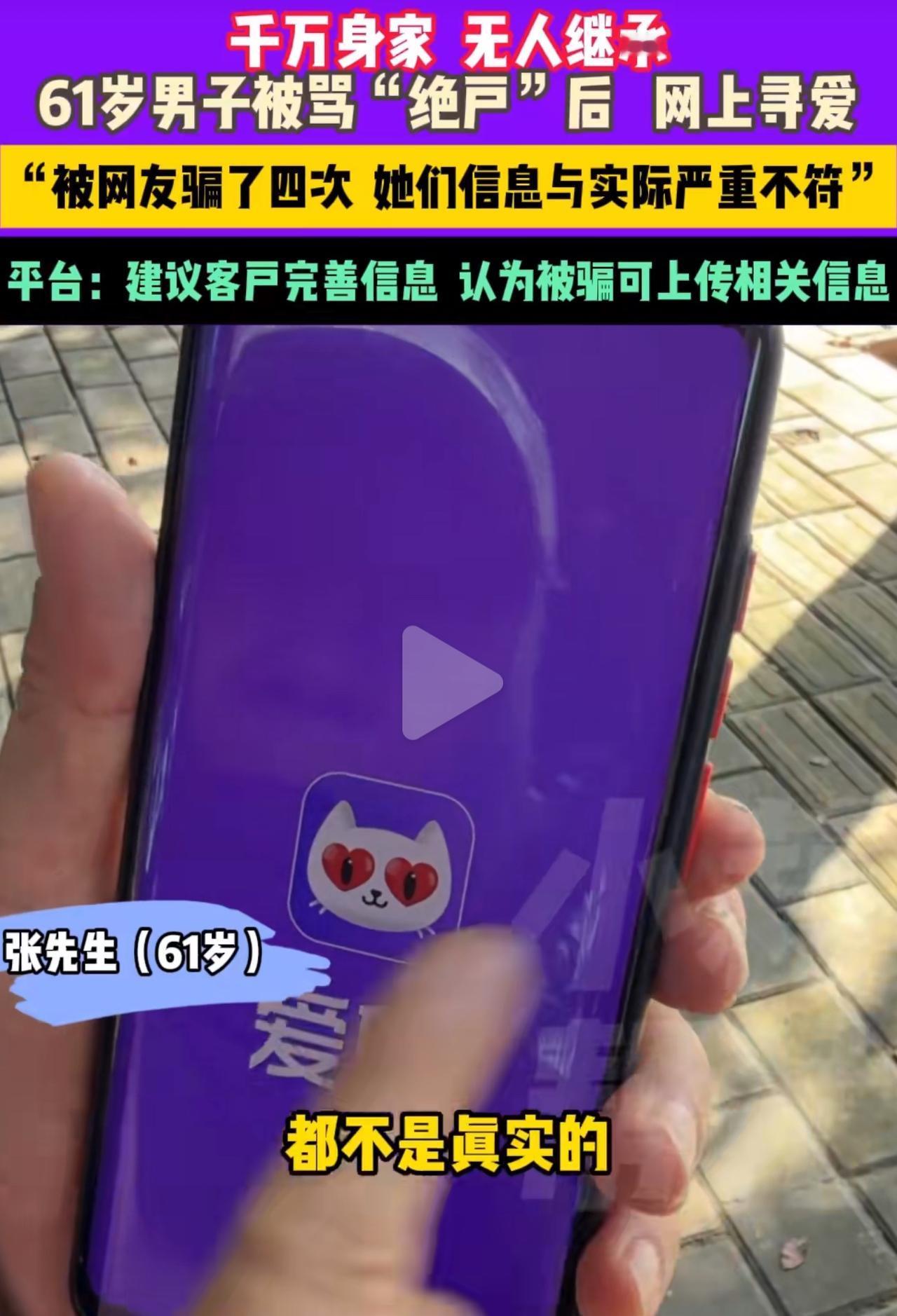 身家千万6旬男子网络交友被骗4次!你敢信吗?手里攥着4套房、200万存款的六旬大爷,居然被同乡一句“绝户”戳中痛处,躲屋里哭了一整晚! 河南这张先生,那真是实打实靠自己拼出来的!打小就跟着眼盲的奶奶讨饭过活,硬生生熬啊熬,总算成了身家千万的主儿。可就因为没个孩子,回趟老家竟被人堵在自家宅基地跟前,指着鼻子骂“断子绝孙”,这话说得,多戳心窝子啊! 那天他哭到天蒙蒙亮,心里憋着股劲:非得在网上找个伴儿生娃不可!一来堵上那些嚼舌根的嘴,二来也给手里的财产找个“归宿”。可刚下了个交友软件就傻了眼:跟人说句话要充5个金币,送朵虚拟玫瑰就得花10块钱。他心里舍不得钱,可又没别的法子,狠狠心就充了。结果呢?跟他聊的那个号称“28岁本科小姑娘”,一见面傻眼了,竟是个48岁连学都没上过的大姐;后来又聊了个说自己“120斤,温柔又会过日子”的,真见着本人,体重得有200多斤,还听旁人说她有小儿麻痹症呢! 最让他气到发抖的是最后那个——平时跟他聊得特投机,嘘寒问暖的,结果是平台客服装的!哄着他充了好几万,最后就退回来8000块。他坐在派出所里翻聊天记录,越看心越凉:那些贴心话,全是骗他掏钱的幌子! 其实他哪是真缺孩子继承财产啊,是心里那股子空落落的劲儿被骗子瞅准了。要是早琢磨琢磨立遗嘱、弄个信托啥的,犯得着急吼吼往网络骗局里钻吗?那些骂他“绝户”的人确实缺德,但他自己把“有后”当成人生唯一的事儿,反倒给了骗子可乘之机。 真心提醒家里的长辈们,网上交友先视频聊聊,身份也得好好查查,遇上要充钱才能聊天的平台,赶紧退出来别犹豫!日子是自己过的,有没有孩子、财产给谁,咱自己说了算,别被旁人的闲言碎语和骗子的甜言蜜语骗了,毁了后半辈子的安稳日子多不值当!婚恋交友诈骗 中年人骗局 交友平台诈骗