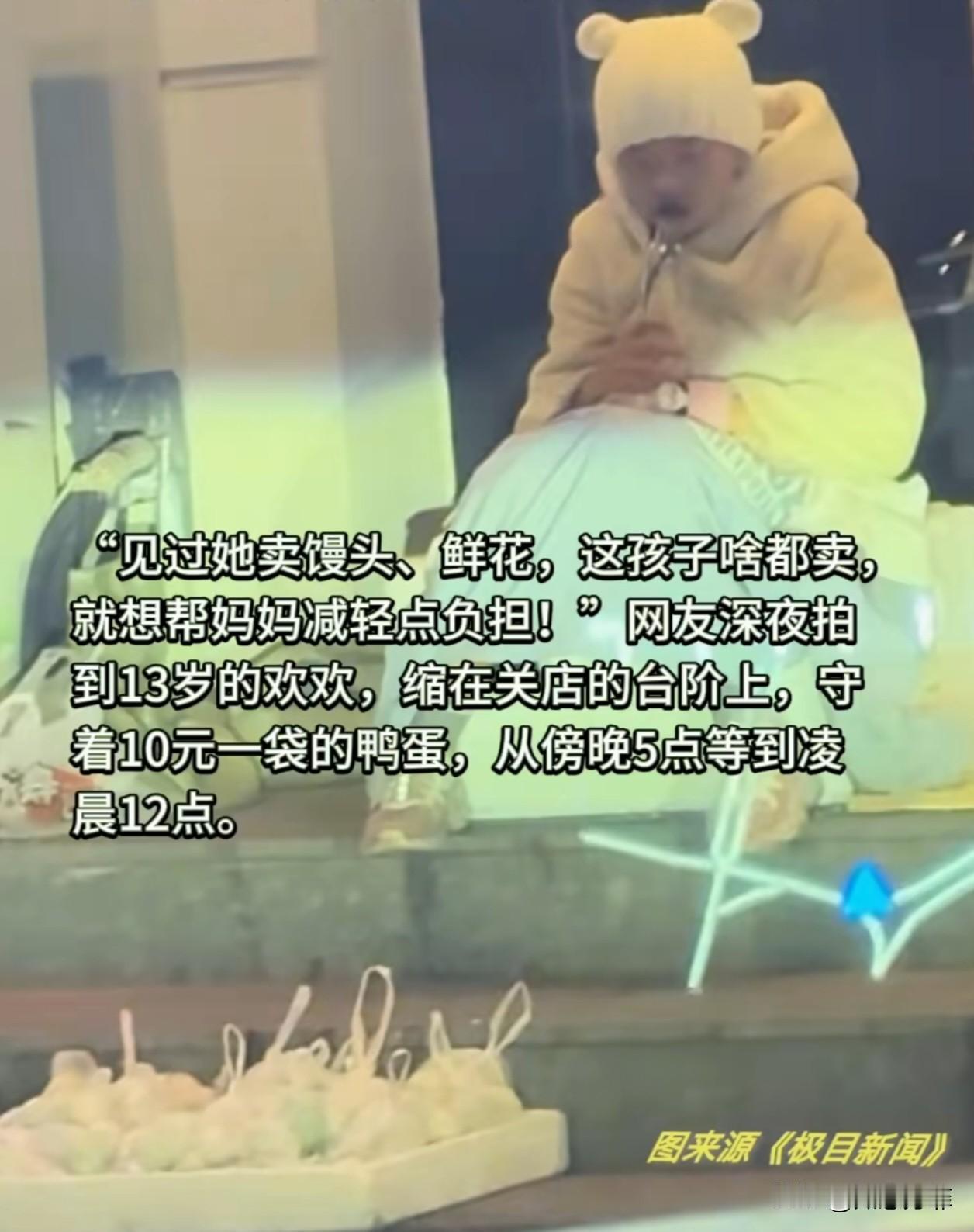 一个13岁的女孩,为了帮妈妈减轻负担,每天放学后和假期,都要在街头摆摊卖鸭蛋,常常守到深夜才回家。知情网友:卖了七八年了,家里困难。 黑龙江,女孩在八个月大时就查出先天性心脏病,父母早年离婚,一直和妈妈相依为命。 妈妈不是不心疼,只是实在抽不开身,偶尔才能陪她出摊,有时会在附近等着但不打扰她。 她卖的鸭蛋4个装一袋,卖10块钱。除了鸭蛋,她还卖过鲜花、小乌龟等小东西,靠自己挣钱糊口,攒医药费。 女孩既懂事又坚韧,她在本该撒娇玩耍的年纪,却能主动为家庭分担压力,从5岁起就开始摆摊赚钱,这种精神让人敬佩。 女孩妈妈同意她出来卖鸭蛋的行为,也能理解,因为妈妈没有正式工作,家庭经济困难,实在是无奈之举,妈妈并非不关心她。 不过,许多网友表示担心女孩深夜独自在外摆摊的人身安全,毕竟她还是个未成年人,在深夜的街头可能会面临各种潜在危险。 最后,希望社会机构和学校能给予女孩更多的关注和帮扶,让她不用再熬夜摆摊,能安心上学,真正改变母女俩的生活。