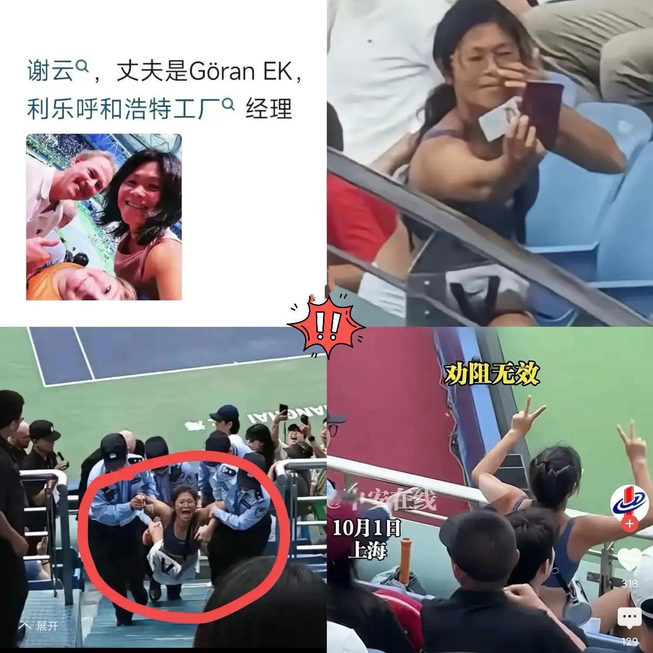 真是开眼了! 谢某某怪不得在上海网球赛场那么嚣张,兴奋,原来是吃了“洋鞭”… 46岁的人了,在赛场上大喊大叫逼停比赛,被工作人员劝着还嘴硬嘲讽,掏出护照拍腿喊“你们没资格管我”,这优越感也太离谱了。连同行的孩子都觉得丢人,她倒好,被架走时还对着观众比耶,完全没意识到自己错在哪。 其实哪有什么“特殊身份”能凌驾于规则之上?警方直接依法处罚,不搞特殊化,这才是最解气的!规矩面前人人平等,再嚣张也没用,没人会惯着这种无视秩序的行为。 你们说,遇到这种无视规则还摆架子的人,就该像这样依法处理才对,对吧?要是换作你在现场,看到这一幕会怎么想?