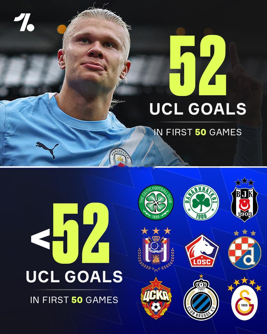 绿茵资讯! ★哈兰德50场欧冠进球数达到52球,追平萨拉赫,并列欧冠历史射手榜第