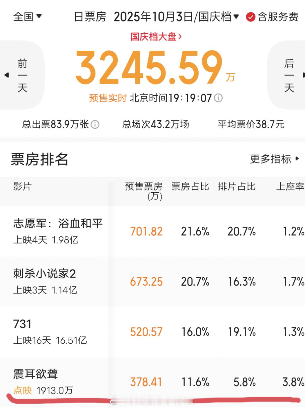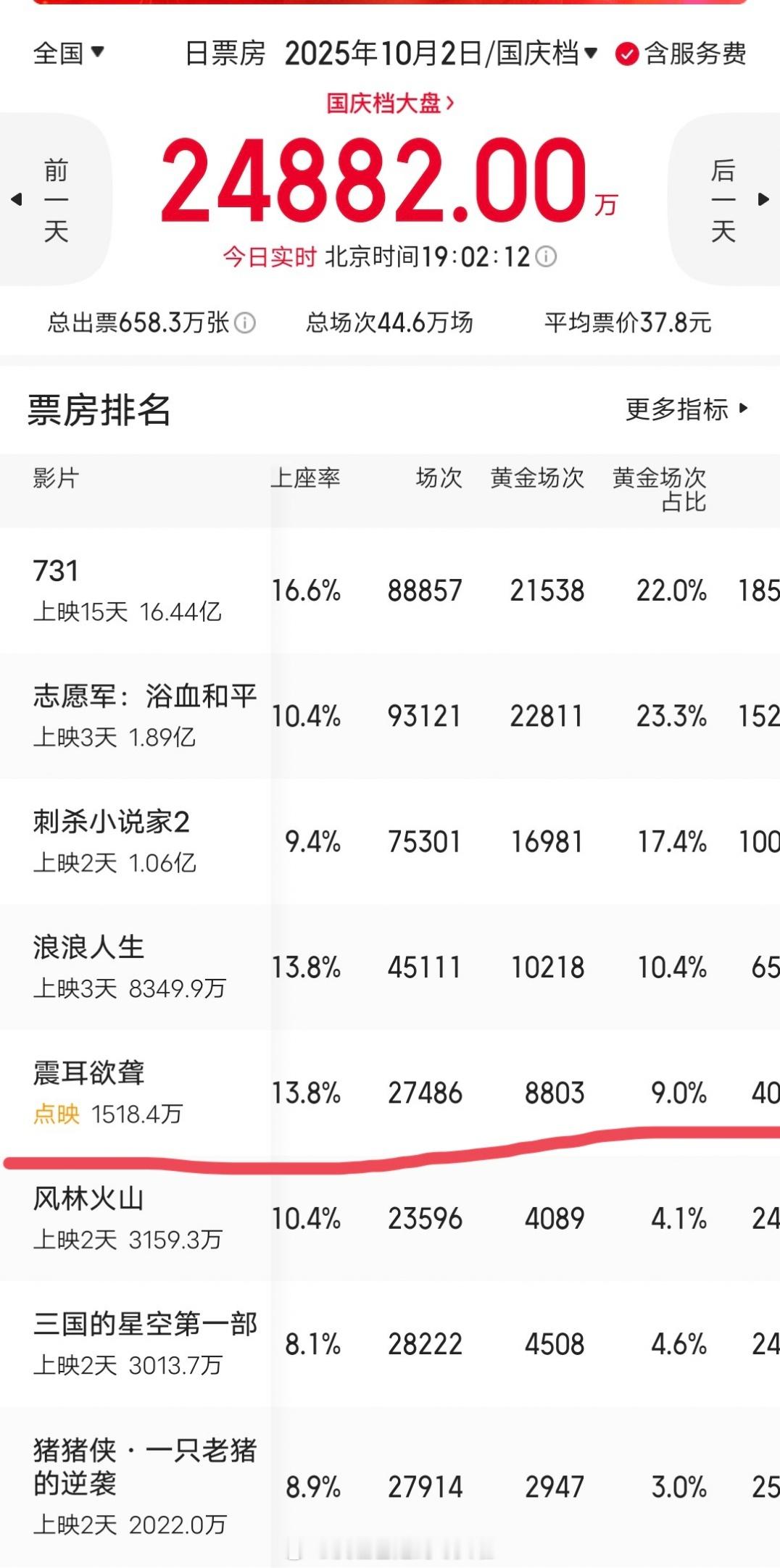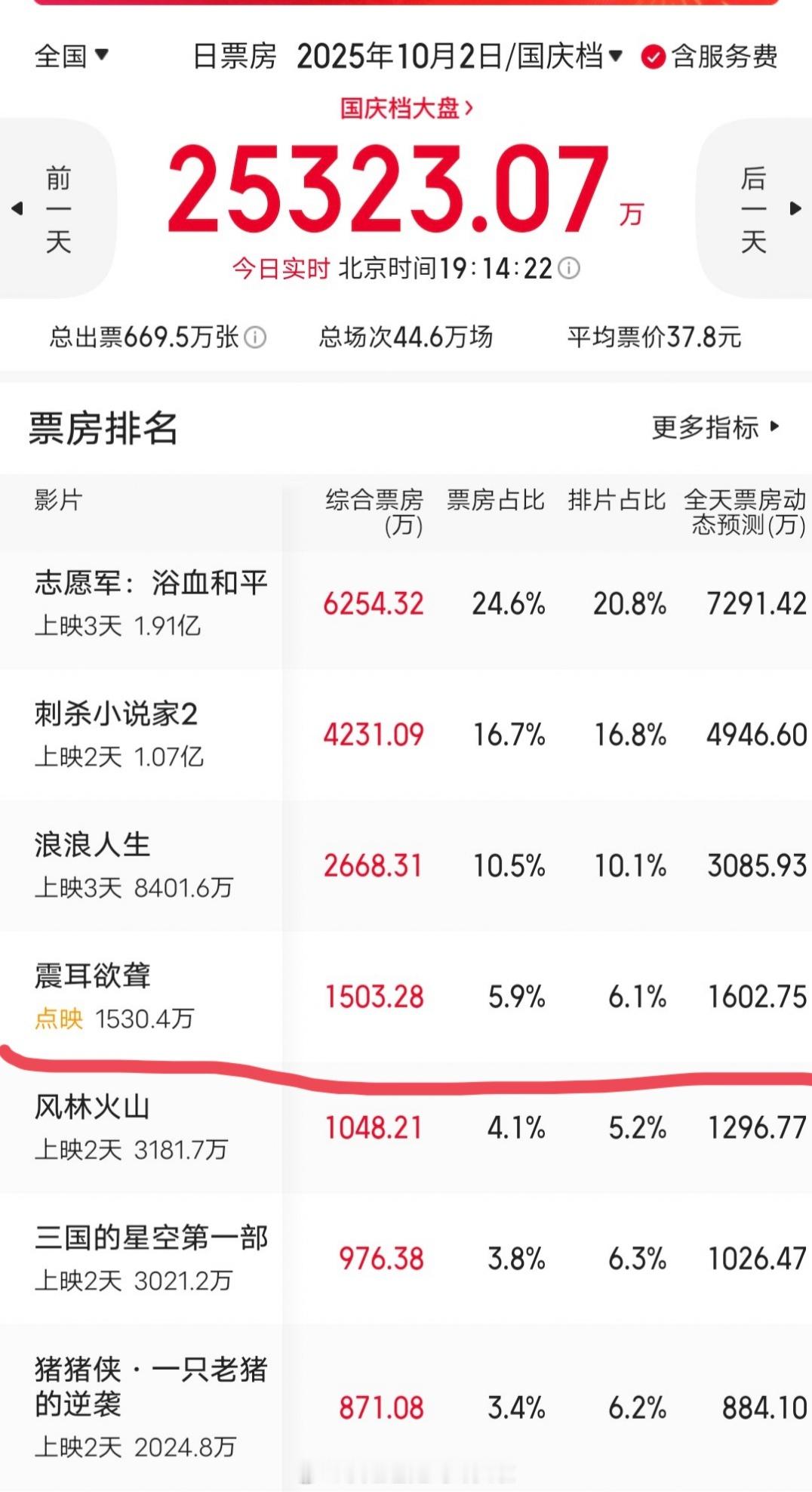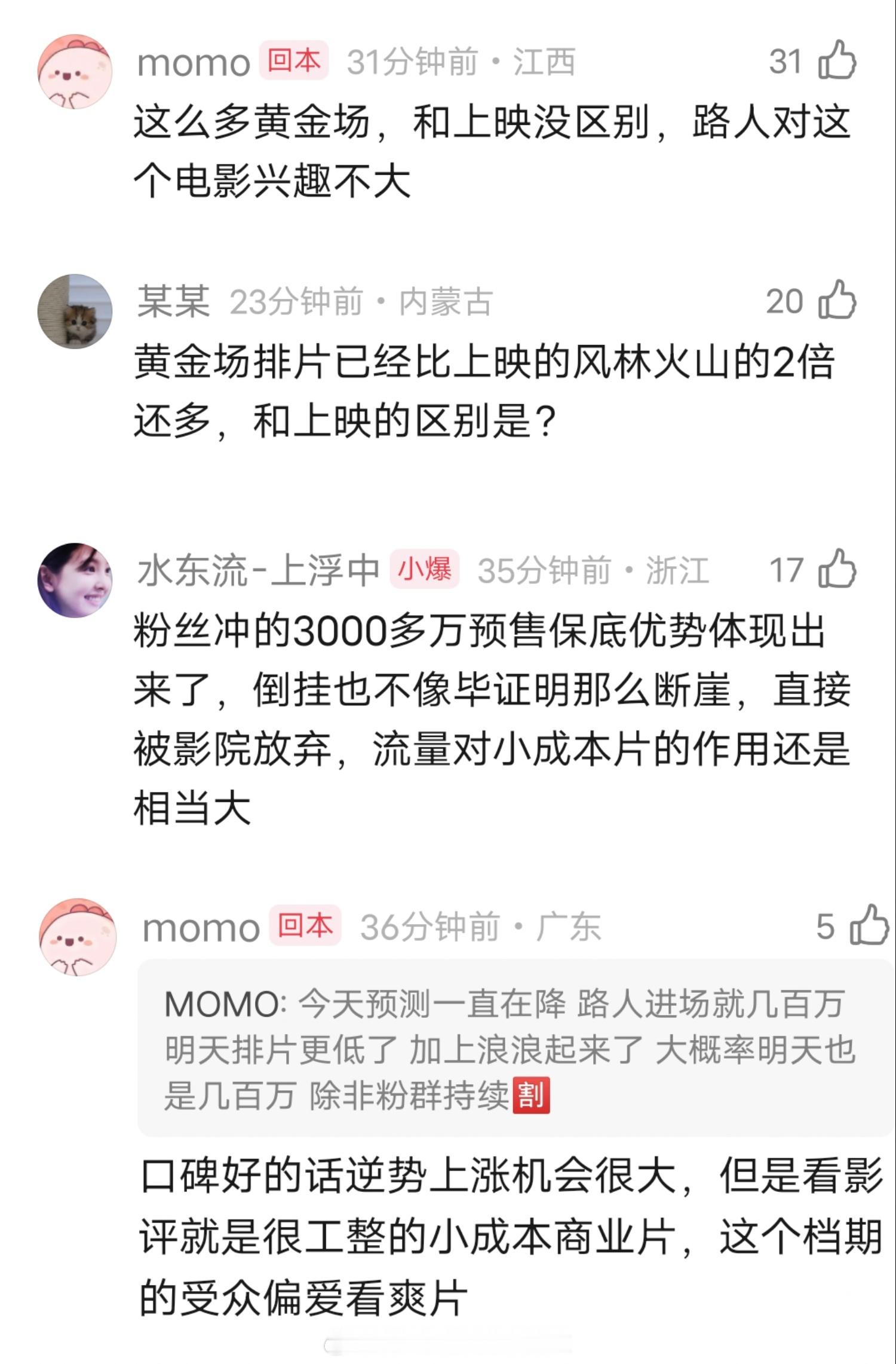 黄金场占比9%,目前远超风林火山,三国、猪猪侠,实时涨幅比不上风林火山,动态跑不赢预测,明天排片也降了。