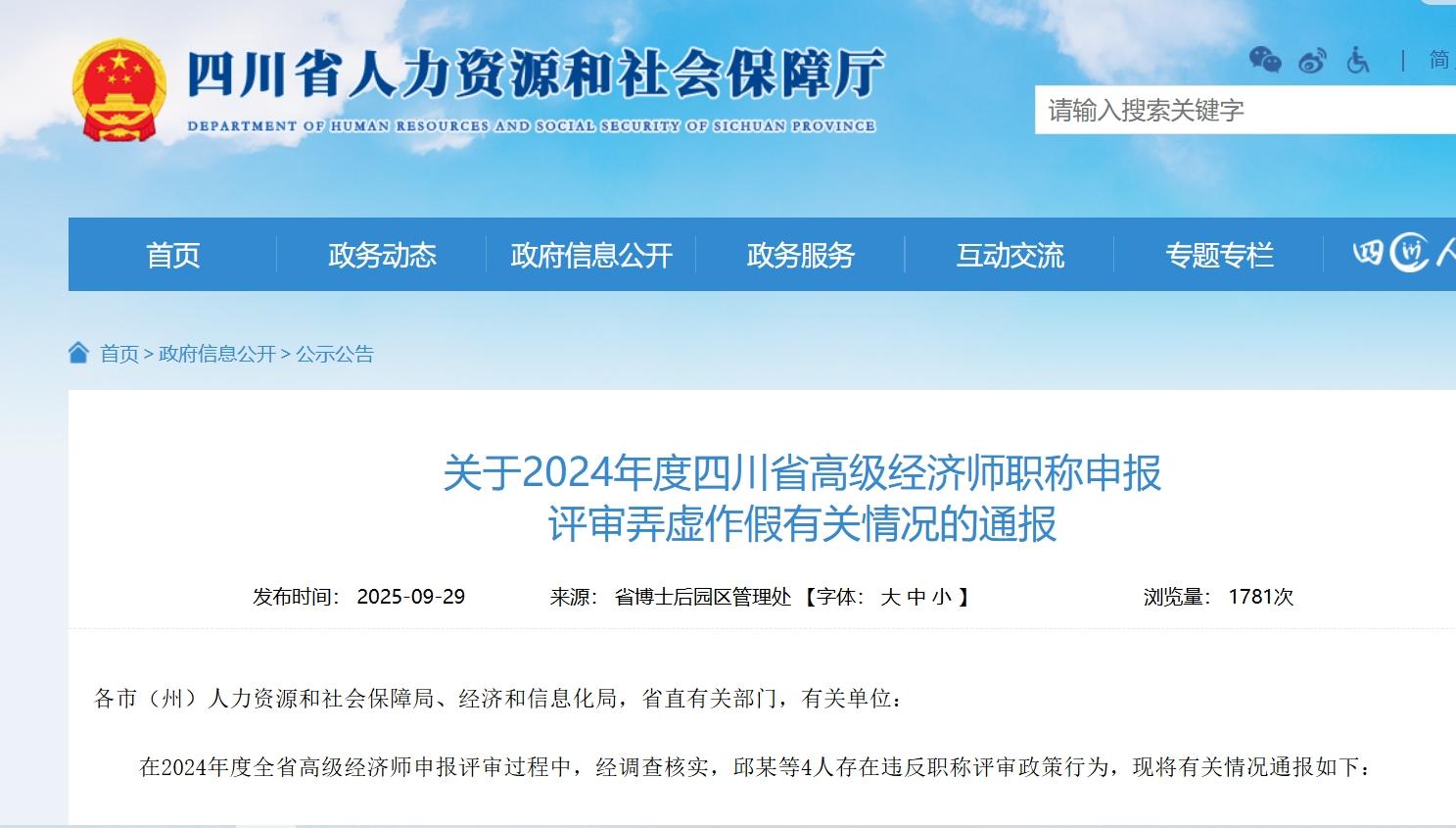 四川省人力资源和社会保障厅、四川省经济和信息化厅近日联合通报2024年度四川省高级经济师职称申报评审弄虚作假有关情况。经调查核实,在2024年度全省高级经济师申报评审过程中,邱某等4人存在违反职称评审政策行为。根据有关规定,现取消邱某、杨某、汪某、邵某2024年度高级经济师评审资格,并记入职称评审诚信档案库,记录期限3年,记录期限内不得申报评审职称。