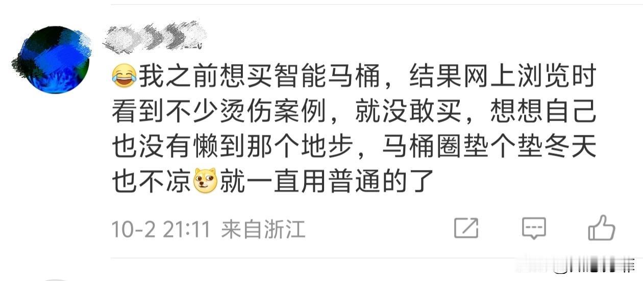 一女子用智能马桶时,马桶突然喷出开水,导致她隐私部位被烫伤,医院诊断为二度烧伤。女子:我整个人被烫得弹起来,尖叫了好久。 女子家里用这个智能马桶三年多了,一直没出现过什么大问题,只是偶尔会感觉冲出来的水有点偏烫,但都没太在意。 出事那天,她像平时一样按马桶的冲洗键,结果按键顿了一下没反应。等了一会儿,马桶突然喷出冒着烟的开水,一下浇在了她的隐私处。 她紧急处理之后,赶忙去了医院,医生诊断为二度烫伤。 不少网友对这件事感到后怕,说自己家的智能马桶也偶尔会出现水温忽高忽低的情况,现在想想十分危险,觉得智能马桶存在安全隐患。 也有懂行的网友提到,听维修师傅说过喷嘴堵塞容易导致水温飙高,但很多人不会定期清理,说明书也早被扔了,忽略了对智能马桶的维护。 所以,大家在享受智能便利的同时,不能忽视安全问题。 使用智能家电时,如果发现异常情况,要及时进行检查和维修。