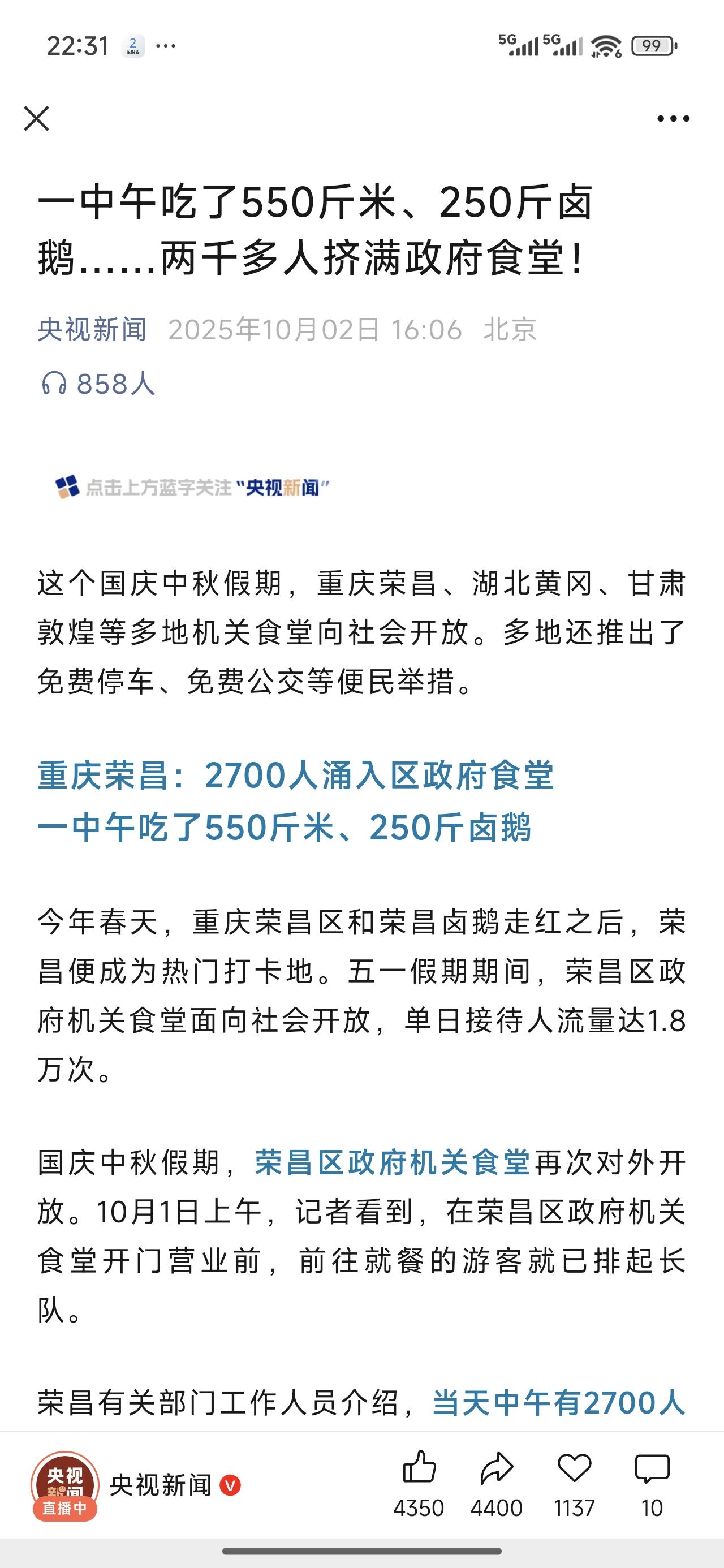 可以说这些地方的领导脑子活,懂得运用流量。一方面帮城市承接了部分流量,另外一方面提升了城市对外口碑,最重要的事拉近了政府与才醒的距离。这种做法值得推广。 多地机关食堂假期像社会开放