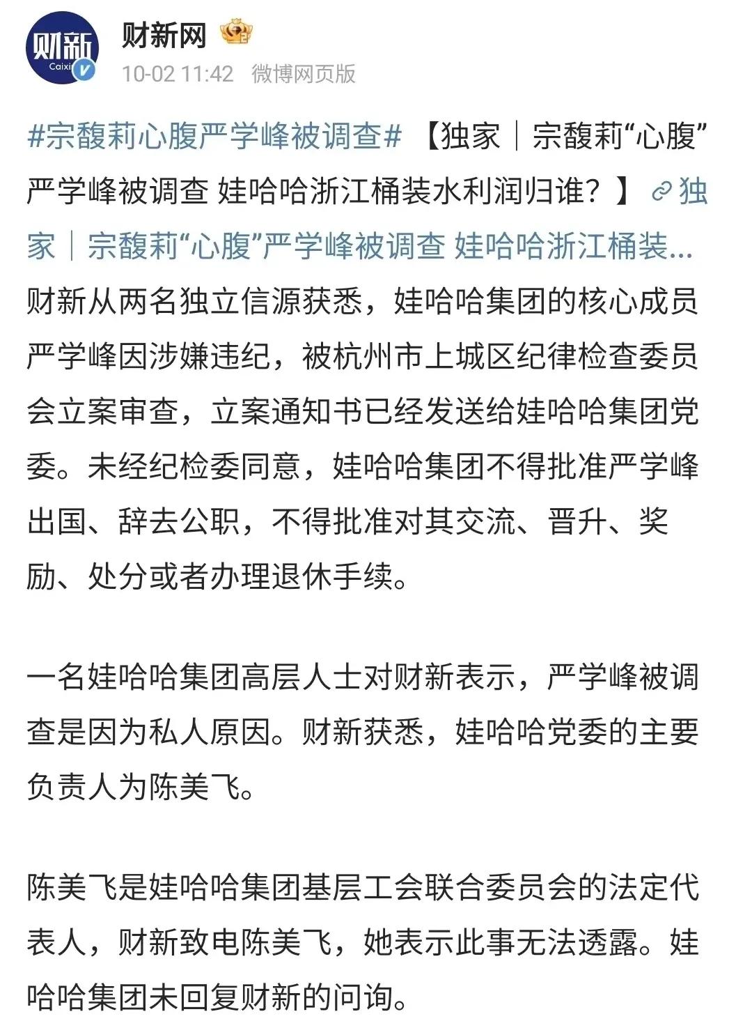 宗馥莉心腹突然被查,这事可能比娃哈哈百亿遗产争夺战更加凶险。就在宗馥莉同三弟妹争夺18亿美元遗产的关键当口,一直被晾在一边的杭州上城国资出手了,对宗馥莉手下大将严学峰立案审查,初步罪名是涉嫌违纪。更值得警惕的是,有报道指出,严学峰已被限制出国,也不得辞去公职,同时明令娃哈哈不得给予严学峰办理晋升或退休手续。 此事在这会曝出,传递的信号非同小可。严学峰称得上是宗馥莉的心腹大将,不光身居宗馥莉宏盛饮料生产中心总监,是浙江娃哈哈桶装水经销商总经理,还在与娃哈哈有关联的180多家公司中担任监事,完全称得上是宗馥莉的核心高管。就在今年4月,宗馥莉将娃哈哈桶装水业务转移到自己宏盛饮料公司旗下时,严学峰正是转移后公司的法人和核心高管。 身边核心大将突然被查,形势对宗馥莉陡然生变,原本杜建英身上并没有对宗馥莉一击致命的证据,可长期默不作声的杭州国资,选择在此时动手,可能会成为整件遗产风波最大的变数。 第一,外界对宗馥莉转移甚至“掏空娃哈哈资产”的说法历来已久,更有央媒对娃哈哈国资流失的问题提出过诸多质疑。争议最大的地方,就是娃哈哈自宗庆后时起,就将娃哈哈经销商和供应链体系转移到娃哈哈集团之外,而这才是真正的娃哈哈,每年娃哈哈几十亿的利润超过95%都来自于这些体系外的公司。而这些公司几乎100%都被宗馥莉所控制。尤其是宗馥莉去年上位后,行事更加有恃无恐,年初差点将娃哈哈300多个商标都转到自己手上。 第二,杭州上城国资1999年,出资2.62亿成为娃哈哈最大股东,可长达26年间,杭州上城居然一分钱分红都没拿到,每年娃哈哈赚的钱基本都进宗家口袋。而且时至今日,娃哈哈千亿估值跟杭州没关系,就连当初的出资都实际缩水了。也就是说,哪怕杭州国资现在退出,当年的2.62亿都拿不回来了。 第三,宗庆后在香港为三个私生子设立的18亿美元信托基金,这笔庞大的资金如何转移出去的?以宗庆后在娃哈哈的股份,他的收入也跟这笔资金完全对不上。更不用说在老妹那边给杜建英买的别墅,有没有动用娃哈哈的钱,也是个问题。 别的不说,就是这三大最受外界质疑和争议的问题,就足以令宗馥莉陷入万劫不复之地。身边心腹突然被查,事出反常必有妖,至于有没有牵涉到宗馥莉和宗庆后的问题,答案应该不会太久。