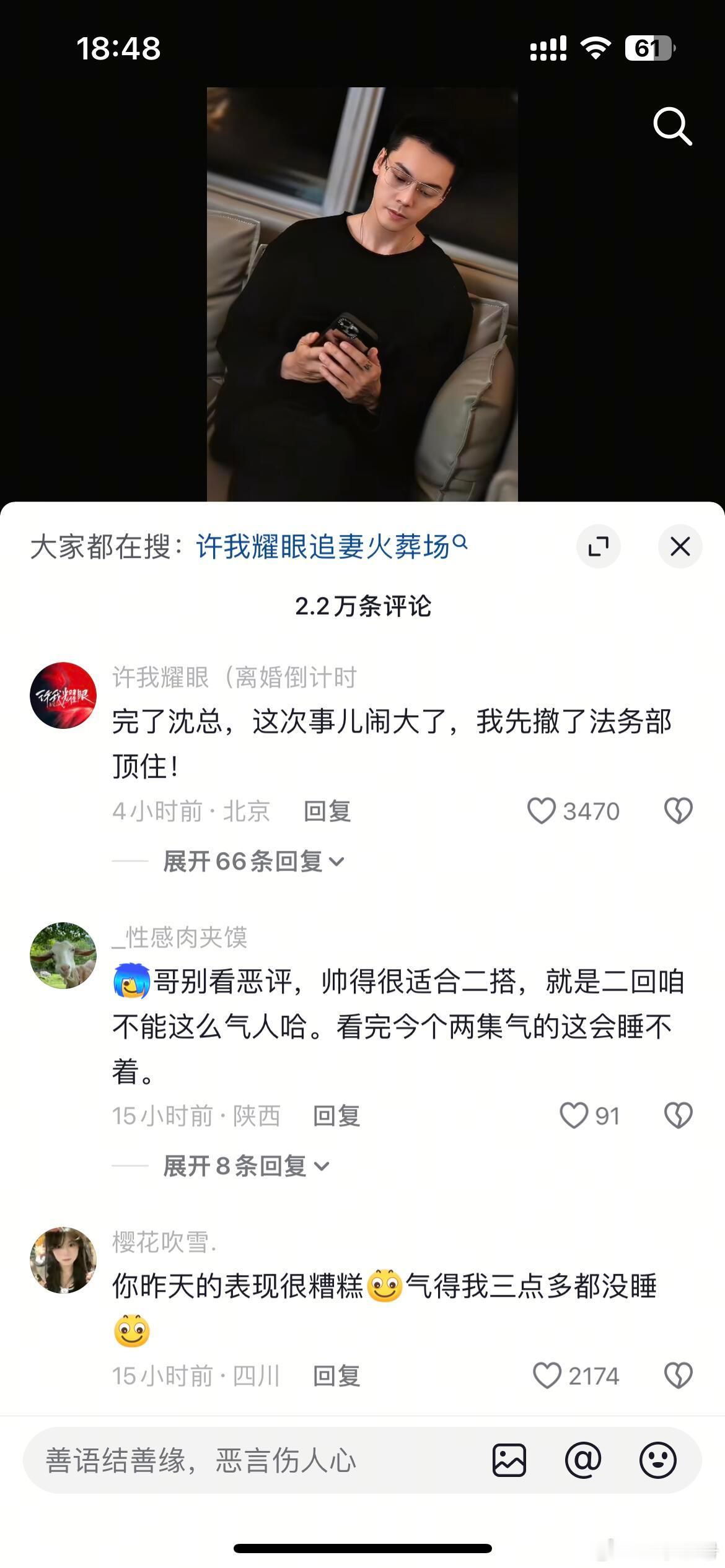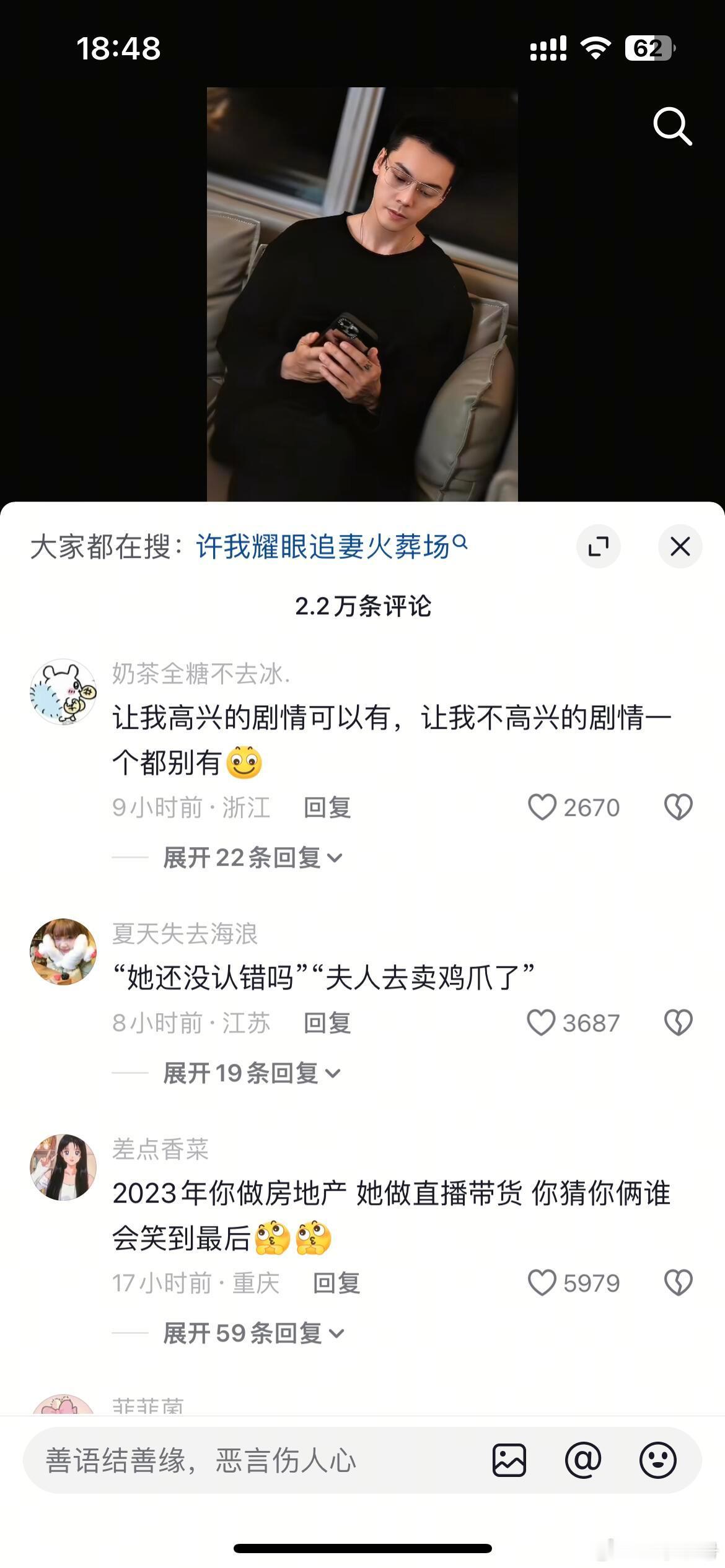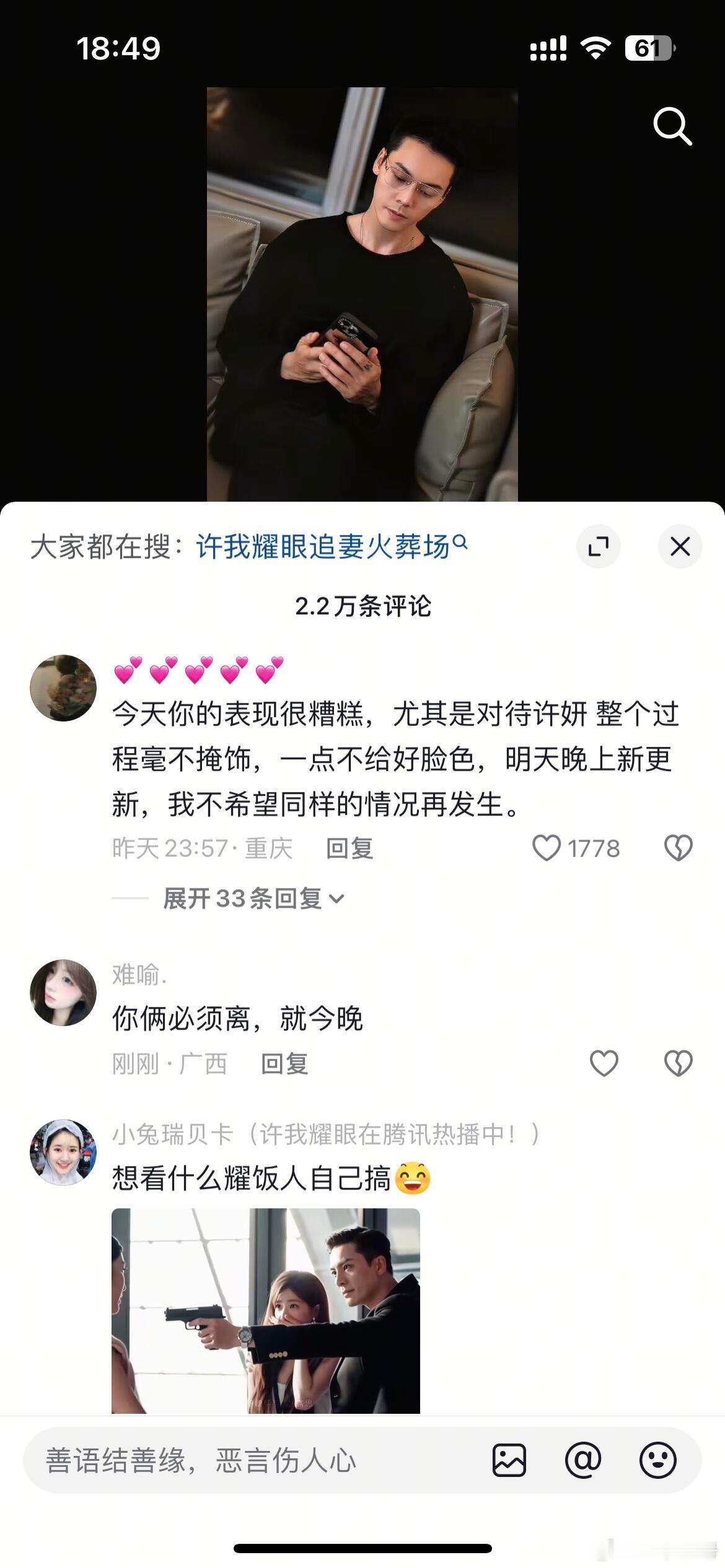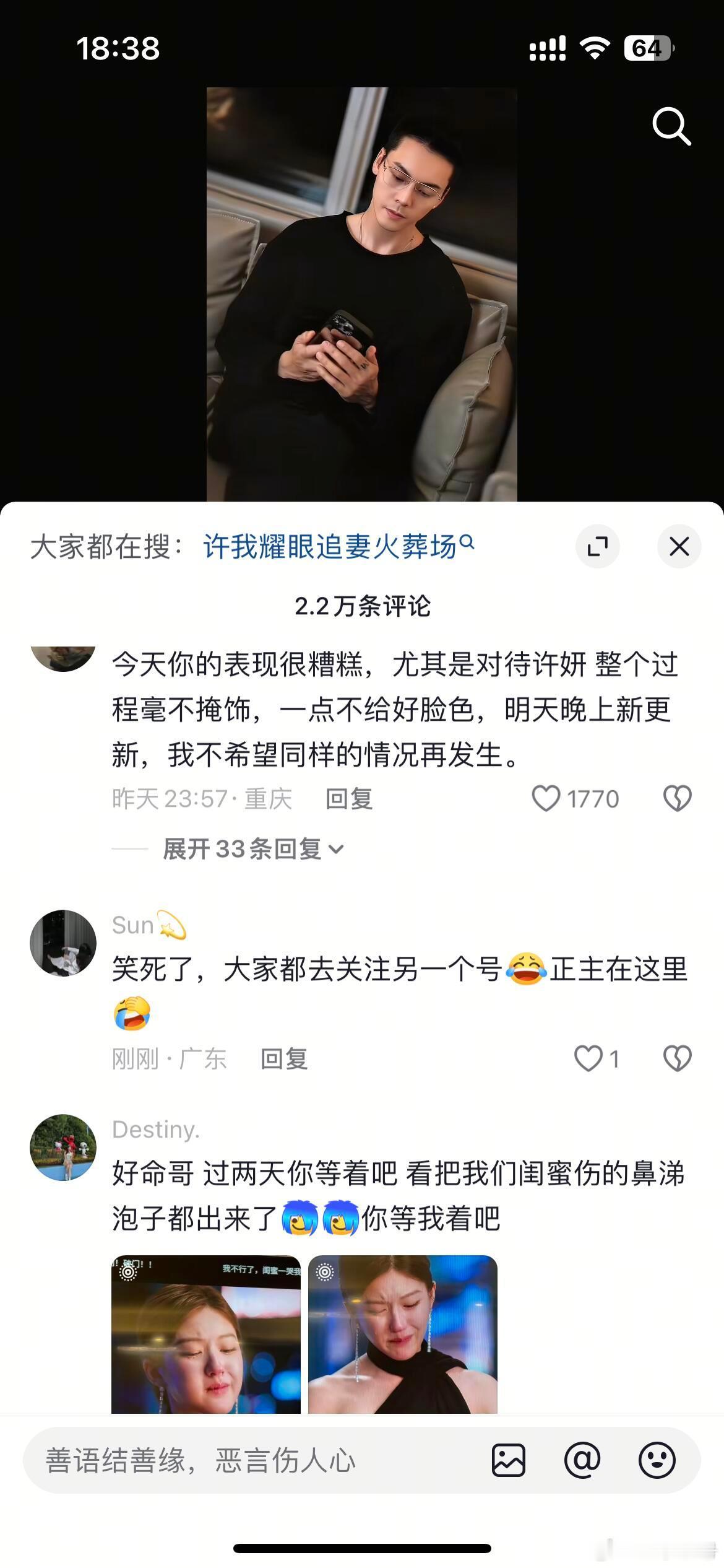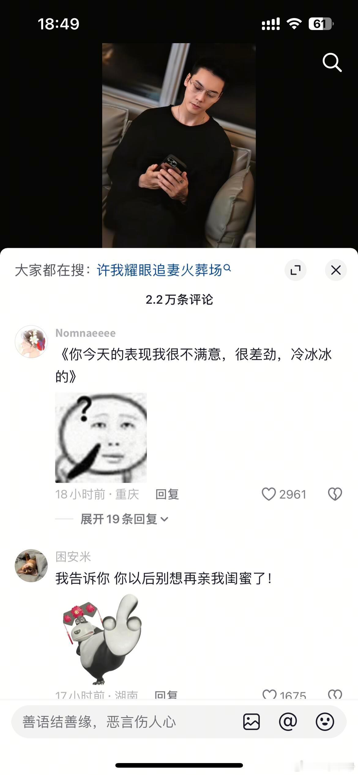 陈伟霆的评论区人均梗王今天你的表现很糟糕,尤其是对待许妍整个过程毫不掩饰,一点不给好脸色,明天晚上新更新,我不希望同样的情况再发生。