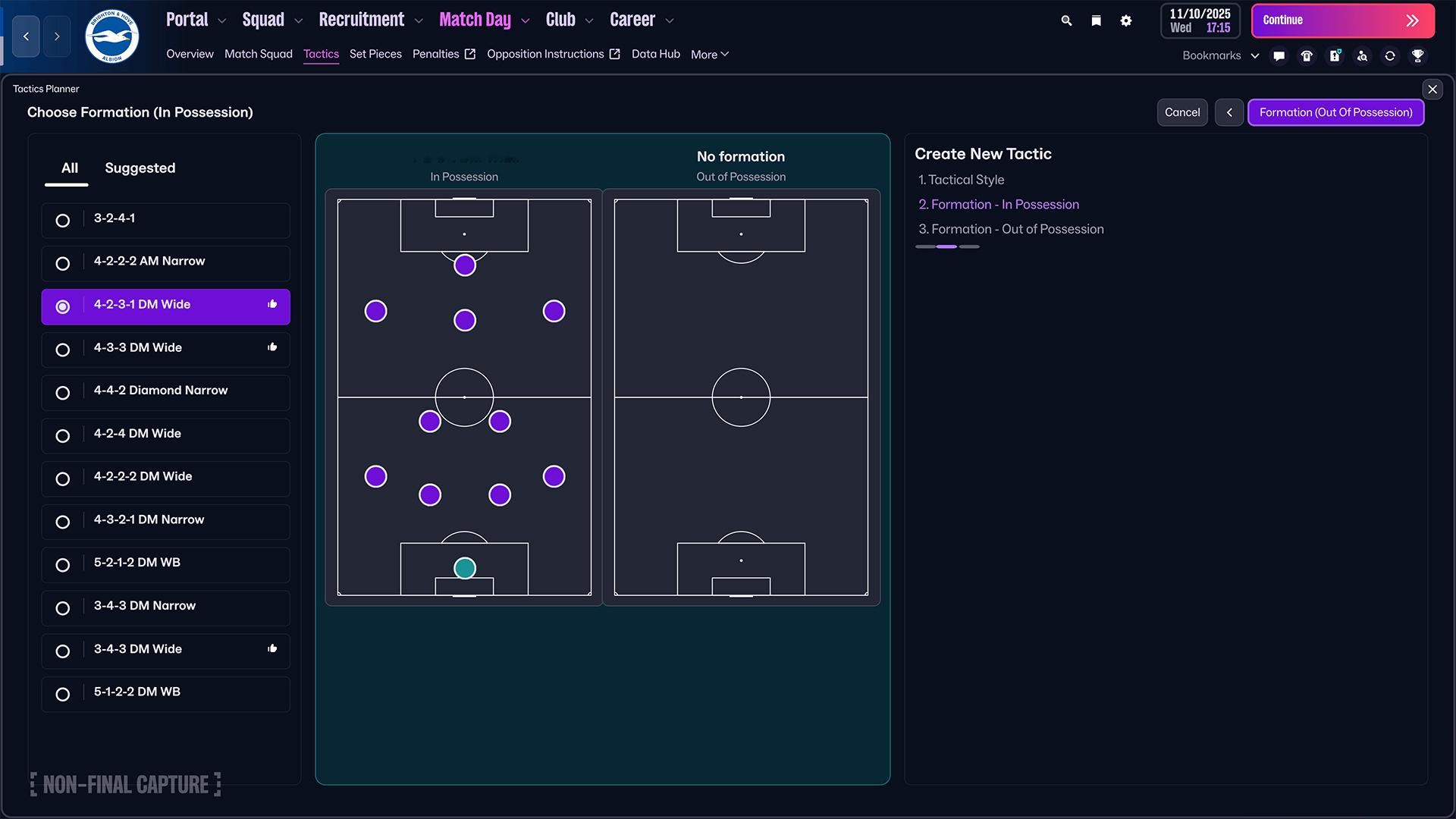新的战术设置流程对老玩家来说将会很熟悉——您仍然会从选择您偏好的战术风格开始。但这一次,您将选择两个阵型,首先是您的控球阵型。可以将这视为您的团队控球时的基础结构,在您从后场开始构建时,布置球员的位置。