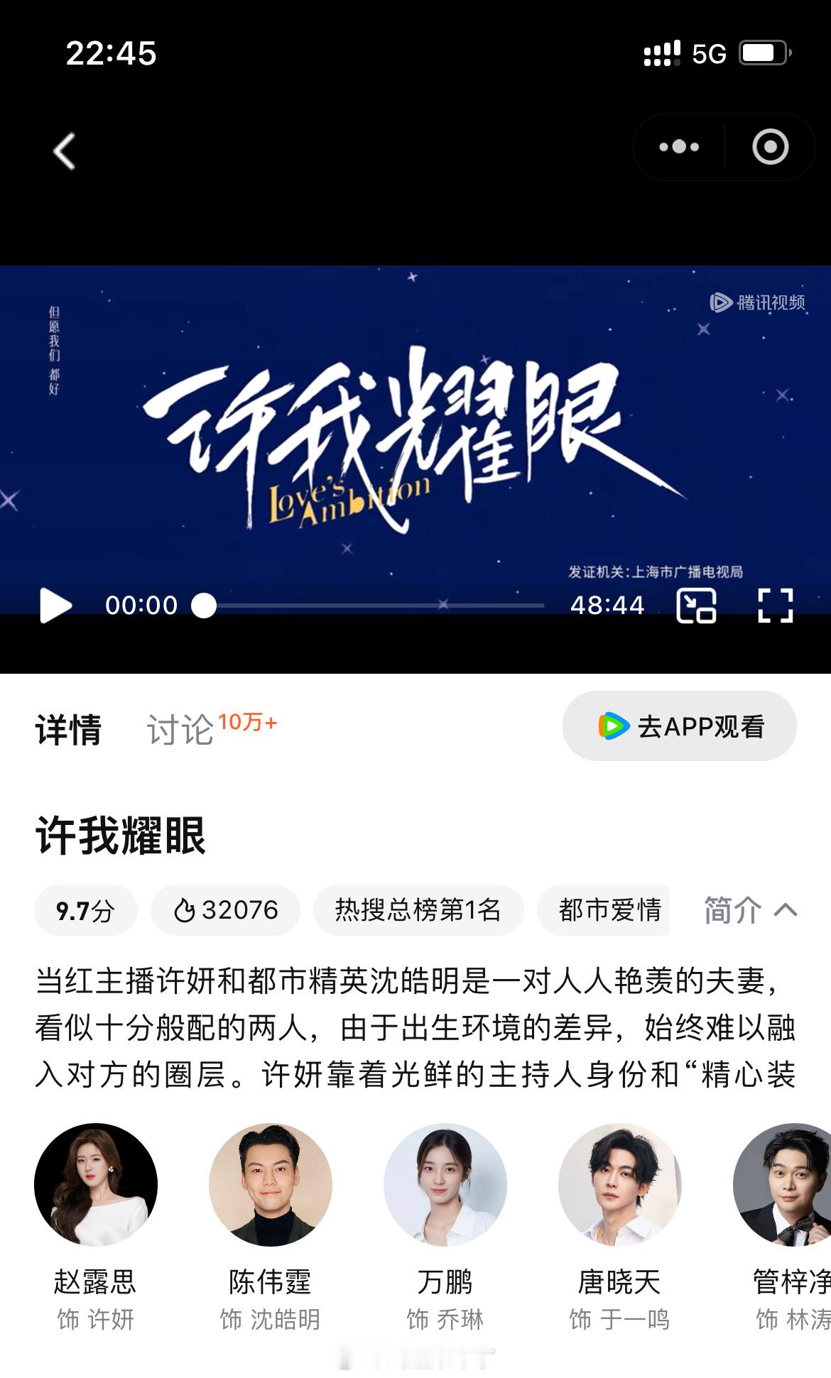 吗呀赵露思、陈伟霆《许我耀眼》腾讯实时热度32076,刷新腾讯视频都市剧热度值历史记录!