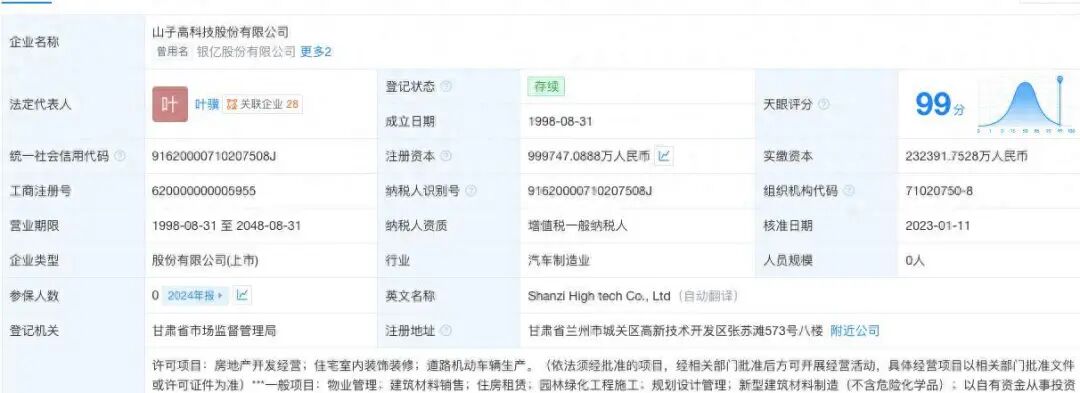 资料显示:山子高科在1998年8月成立,前身为银亿股份,是一家宁波的房地产巨头。2016年跨界宣布进军汽车零部件领域,2019年破产进入重整阶段。次年,银亿股份通过"资本公积转增股本+以股抵债"的方式盘活公司。2023年1月,银亿股份正式更名为"山子高科技股份有限公司",同一年山子高科以摘牌方式收购邢台信德产业发展有限公司持有的邢台龙冈投资发展有限公司90%股权,获得了相应的造车资质。去年7月,山子高科首款量产车型云枫汽车ks01下线。