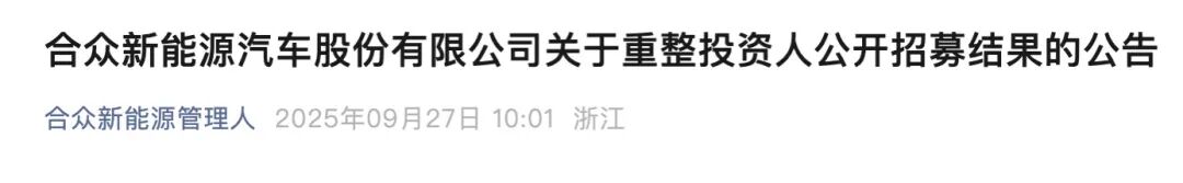 9月27日,合众新能源管理人发文称,截至意向重整投资人报名截止日,已有一家意向重整投资人按要求提交完整报名材料并缴纳报名保证金5000万元。有媒体报道透露,山子高科就是官方发布的唯一意向重整投资人。当然,最终是不是山子高科技股份有限公司接盘合众新能源,这个还有待官方的公布。
