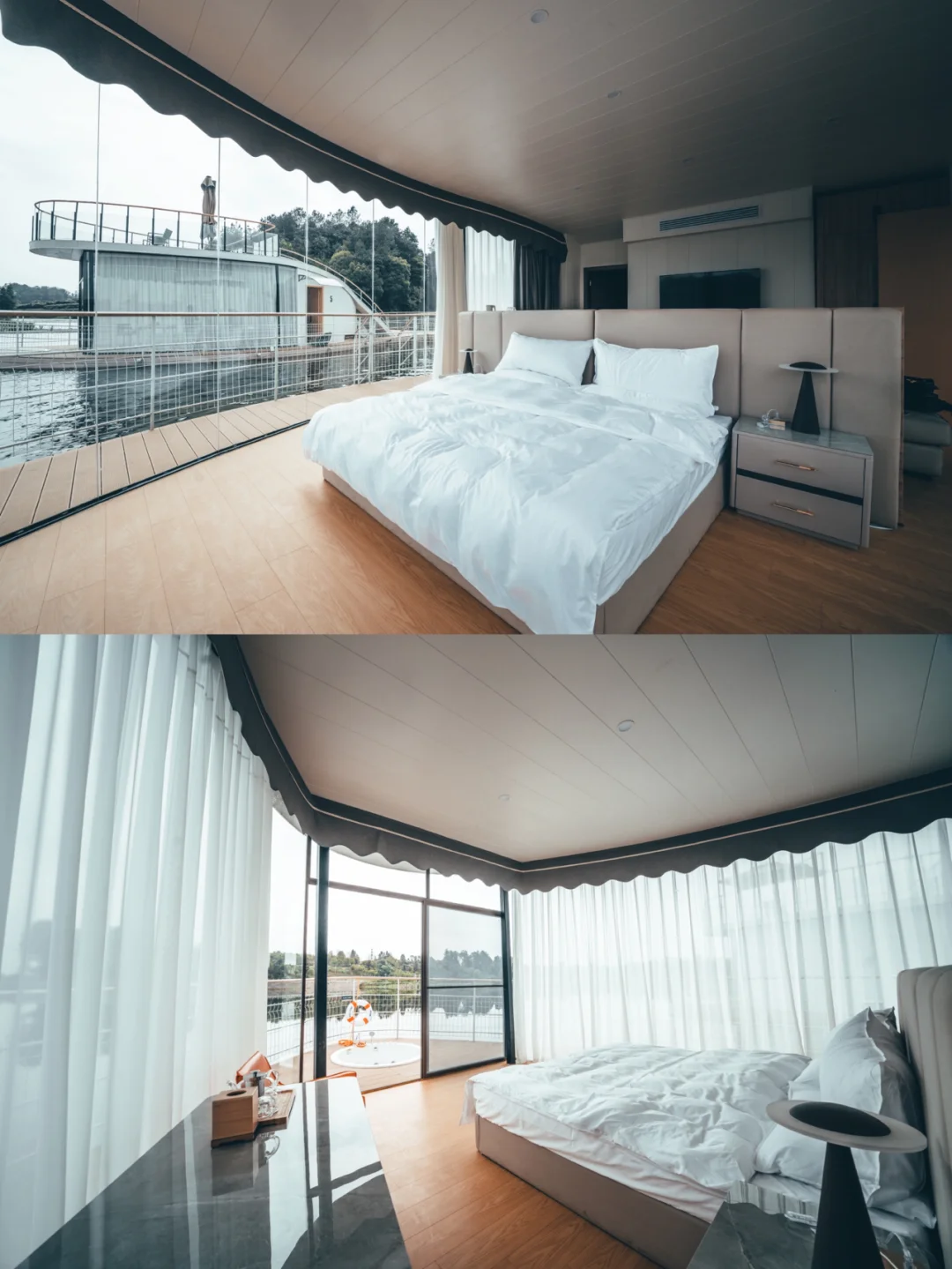 今天来到了四川雅安名山区的月亮湖景区,这里一家特色民宿!渔宿是国内第首家漂浮在水上的民宿,在月亮湖景区湖面上矗立着水上独栋漂浮民宿建筑群,目前一期项目共有5个房间,单栋船屋面积约150平米,房间套内面积在45平米左右,每栋为两层,一层为双人大床房、客厅、卫生间、船头露天泡澡浴缸;二层为甲板。入住的客人能够体验到星级酒店的早餐、烧烤以及小火锅。