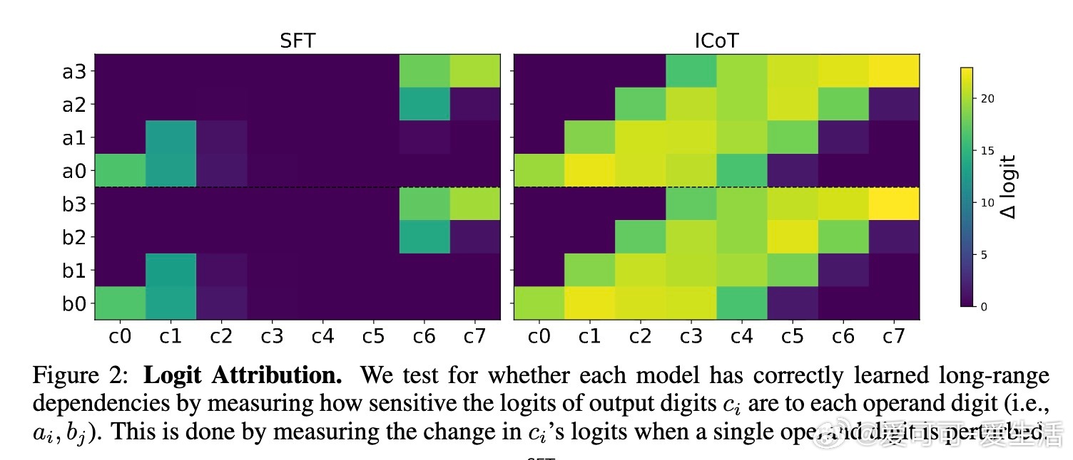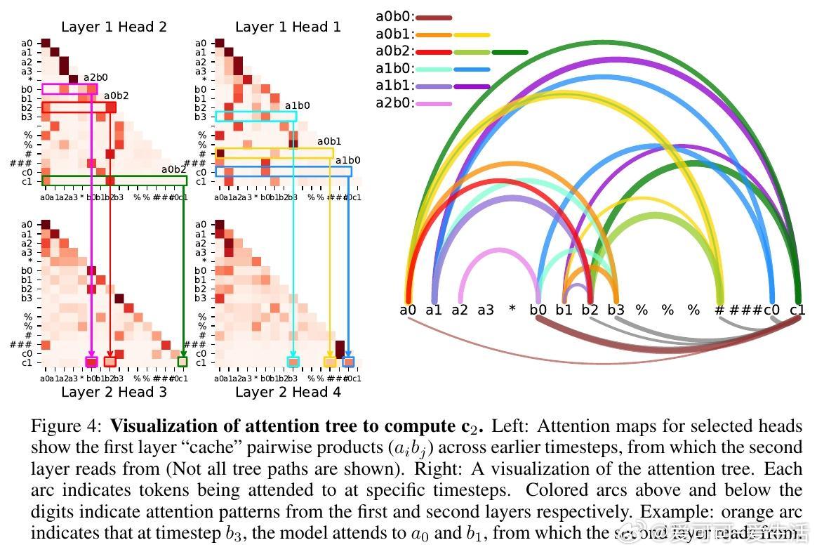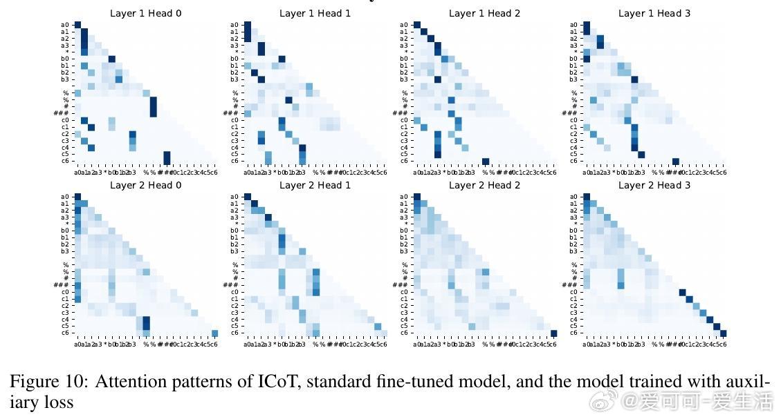 • ICoT(隐式链式思维)训练策略成功破解难题:通过训练初期引入显式链式思考步骤,逐渐移除辅助推理标记,模型学会内部“缓存-检索”机制,将乘积部分分解成有向无环图结构,形成“注意力树”捕获关键数字对乘积。