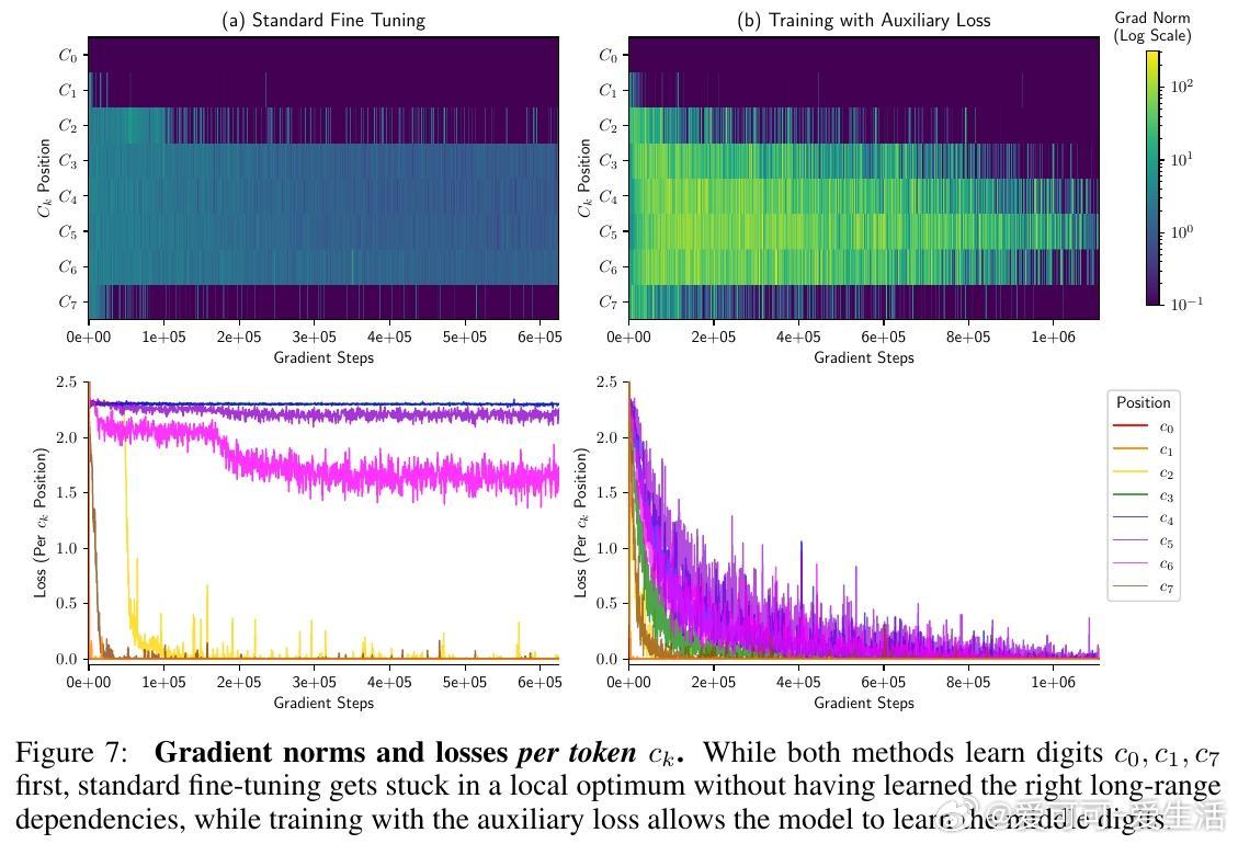 • 简单辅助损失促进突破:引入预测“运行部分和”的线性回归辅助损失,给予模型明确的中间量监督,帮助其学会长程依赖,实现99%以上准确率,无需显式链式思考标记。