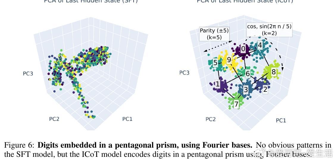 • 几何表征创新:ICoT模型将数字嵌入傅里叶基底,部分乘积对应注意力头输出的Minkowski和,数字在特征空间呈现五边形棱柱结构,极大提升了表示效率与推理精度。