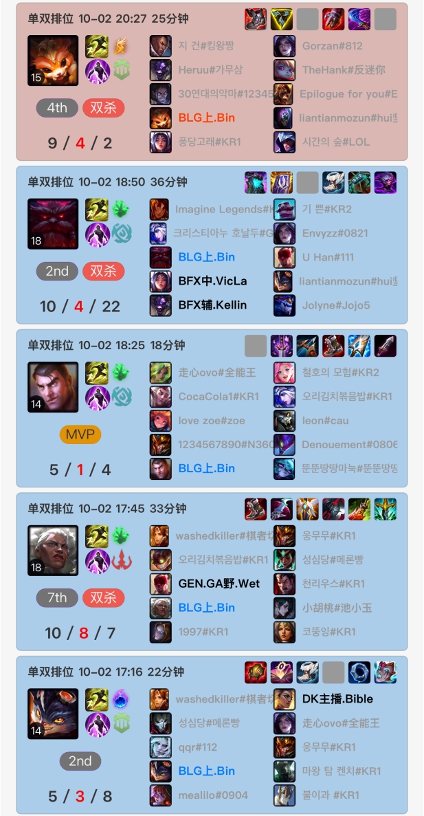 不过Bin似乎已经开始了提前训练,翻看LPL/LCK两个赛区八支队伍的选手Rank记录,只有Bin从昨日开始进行了Rank训练,真太想赢了?