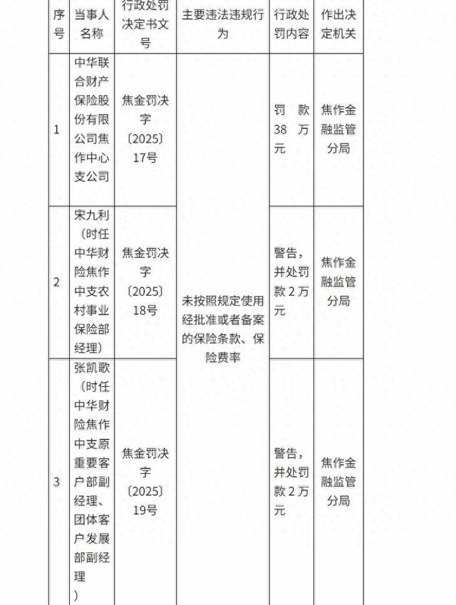 焦金罚决字〔2025〕17号-19号行政处罚决定书显示,因未按照规定使用经批准或者备案的保险条款、保险费率违法违规行为,中华联合财产保险股份有限公司焦作中心支公司被罚款38万元;对宋九利(时任中华财险焦作中支农村事业保险部经理)处以警告,并处罚款2万元;对张凯歌(时任中华财险焦作中支原重要客户部副经理、团体客户发展部副经理)处以警告,并处罚款2万元。(信网记者)