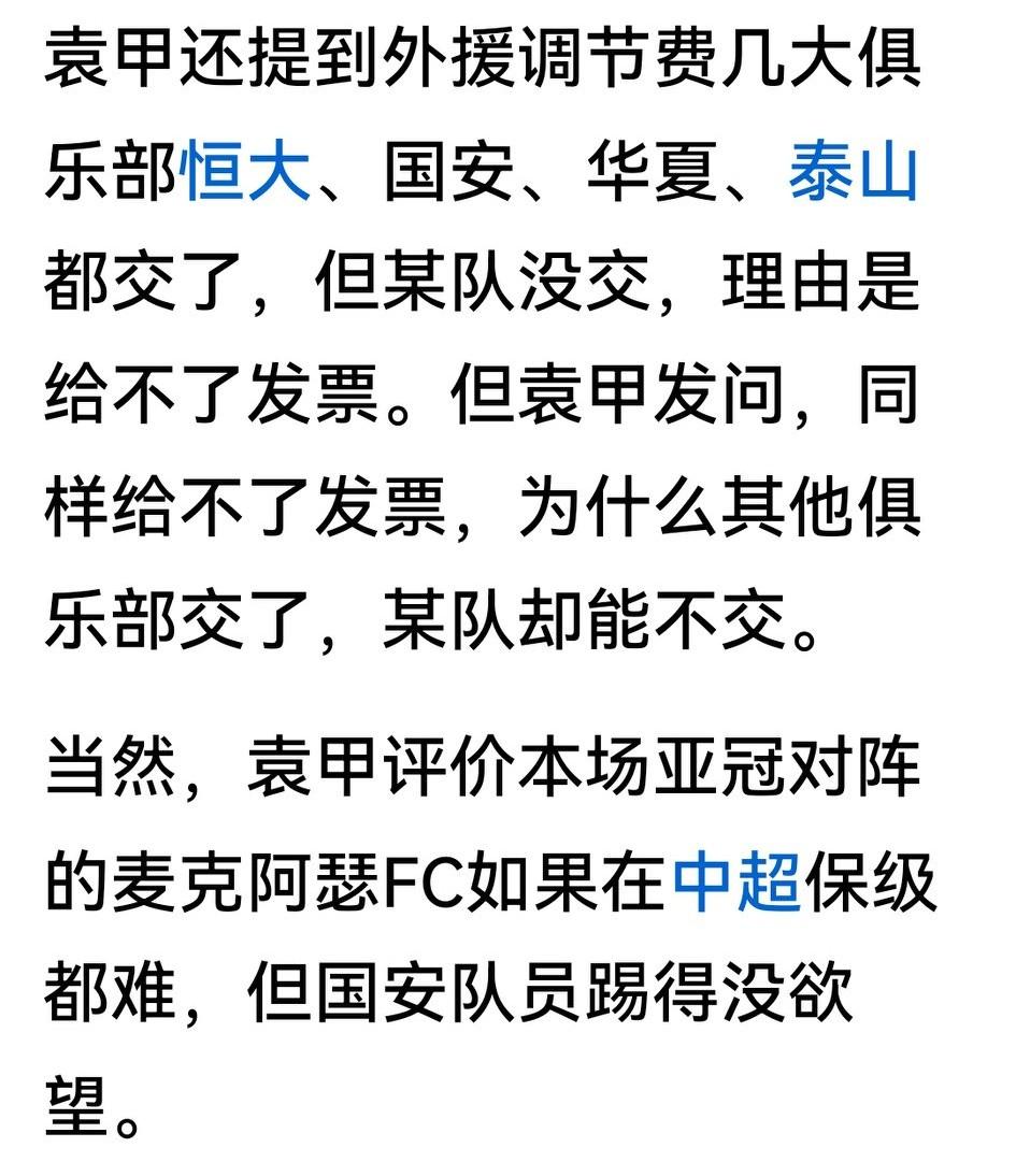 太恐怖了!一场球的输赢,竟然越扒越深。 京城媒体人袁甲提出希望足协返还4个亿的外援调节费,为国安解困。更令人惊异的是,袁甲说恒大国安华夏泰山都交了某队却不交,有上海网友回应足协开不出发票是根本原因。这就奇了,其他队近20亿的钱款,竟然不出发票,天下还有此等事情? 足坛第一金哨马宁说“球场不是法外之地”,球迷感兴趣的是,马宁之后袁甲会不会成为足坛外援调节费问题的第一吹哨人?