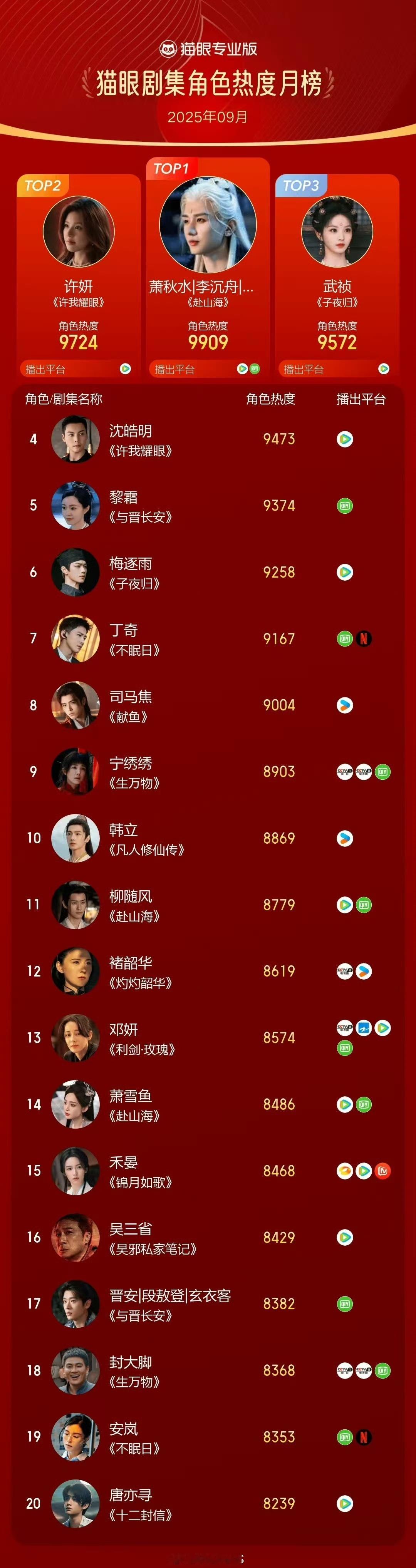 成毅萧秋水登顶9月猫眼角色热度榜成毅萧秋水猫眼角色热度月榜top1成毅萧秋水登顶9月猫眼角色热度榜,厉害,[送花花][送花花]
