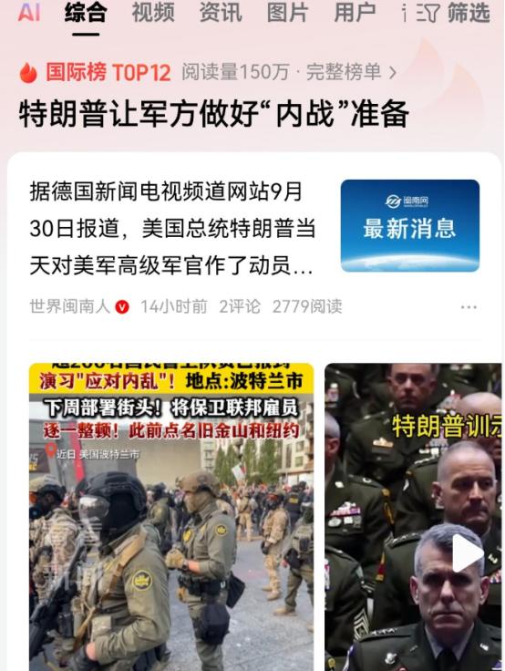特朗普跟赫格赛斯的整风大会结束之后,他终于露出了自己的真实企图,那就是爆发美国内战。 白宫准备向各州手里抢权力了! 特朗普还是要打破美国200多年的惯例,分权制行不通了,还是要走集权制! 特朗普在演讲中做了动员令,他向美国将领们表示。 激进的左翼民主党人,正在旧金山芝加哥纽约波特兰洛杉矶等地,放任非法移民涌入。 就在讲话前两天的9月27日,他刚宣布向俄勒冈州波特兰市派兵,理由是"保护被战争蹂躏的城市"和联邦设施。可俄勒冈州州长科特克直接戳破说当地安全状况一切正常,这就是滥用职权。 波特兰市长、民主党人基思·威尔逊更直白,说根本没请求也不需要联邦军队干预。 这已经不是第一次了,今年6月7日洛杉矶移民冲突时,特朗普就在加州州长纽森没同意的情况下,硬派2000名国民警卫队进驻;8月又往华盛顿部署了超过2000名国民警卫队,还把芝加哥、纽约这些民主党城市叫做"问题城市"。 短短三个月,从西海岸到东海岸,联邦军队在没有州政府请求的情况下频繁进驻地方,这在美国历史上都是极为罕见的。 更关键的是,这种行为直接踩了美国分权制的红线。 美国的联邦和州之间早就划好了权力边界,根据宪法,除非州政府请求,总统根本没权力调动军队到地方执法。 这是自1965年以来头一次出现总统单方面调动州国民警卫队的情况,已经涉嫌违宪。 前国防部长马蒂斯说得更透彻,他早在2020年就指出特朗普是"故意分裂美国人民",现在看来这话一点不假。 特朗普一边喊着"内部战争",一边把军队当党派斗争的工具,本质上就是想把权力从各州手里抢过来,打破分权制衡的惯例搞集权。 但美国这套运行了两百年的体制,真不是那么容易被打破的。就拿这次波特兰派兵来说,不光州长市长反对,华盛顿哥伦比亚特区总检察长施瓦尔布已经就联邦军队部署一事提起诉讼。 更有意思的是德国媒体提到的会场细节,特朗普和国防部长赫格塞思在演讲时停顿等掌声,结果底下一片沉默,特朗普还说"谁想走可以走,但得放弃前程"。 这说明军方内部对这种政治操弄根本不买账,沉默本身就是一种抗议。 要知道美国军队有严守政治中立的传统,当年内战爆发前南方各州是靠脱离联邦才动员起军队,现在特朗普想让美军直接参与国内政治斗争,光是军队内部的阻力就不小。 再看看历史对比就更清楚了,1861年内战爆发前,南方各州是因为奴隶制存废这种根本性矛盾才选择分裂,当时双方在经济基础、意识形态上已经完全对立。 而现在特朗普虽然闹得凶,但民主党城市再怎么反对,也没到要脱离联邦的地步。 各州手里还有不少反制手段,比如通过法律诉讼拖延联邦政策,利用媒体曝光滥用职权行为,这些都是分权体制自带的"安全阀"。 就像加州之前对抗移民政策那样,各州完全可以通过地方立法来抵消联邦政府的干预,特朗普想靠派几支军队就搞成集权,根本不现实。 不过话说回来,虽然现在爆发内战的可能性不大,但特朗普这种操作对美国体制的侵蚀已经很明显了。 他把民主党说成"激进左翼恐怖分子",把城市治理问题上升到"内部战争",本质上是在制造社会分裂。赫格塞思宣布取消所有平等和反歧视项目,特朗普还说要"重新唤醒战士精神",这些举动都是在把军队政治化,而军队一旦卷入党派斗争,美国的政治平衡就危险了。 当年罗马共和国就是因为军队成为将领的私人工具才走向帝制,这个教训美国的建国者们比谁都清楚,所以才设计了这么复杂的分权体制。 现在的情况是,特朗普想打破惯例搞集权,但各州、司法系统、甚至军队内部都在形成反制力量。 说白了,特朗普的真实企图确实是想突破分权制的限制扩大联邦权力,这种"内部战争"的言论,更是是在破坏民主的根基,要是任由这种将政治对手妖魔化的做法蔓延,美国的政治极化只会越来越严重。